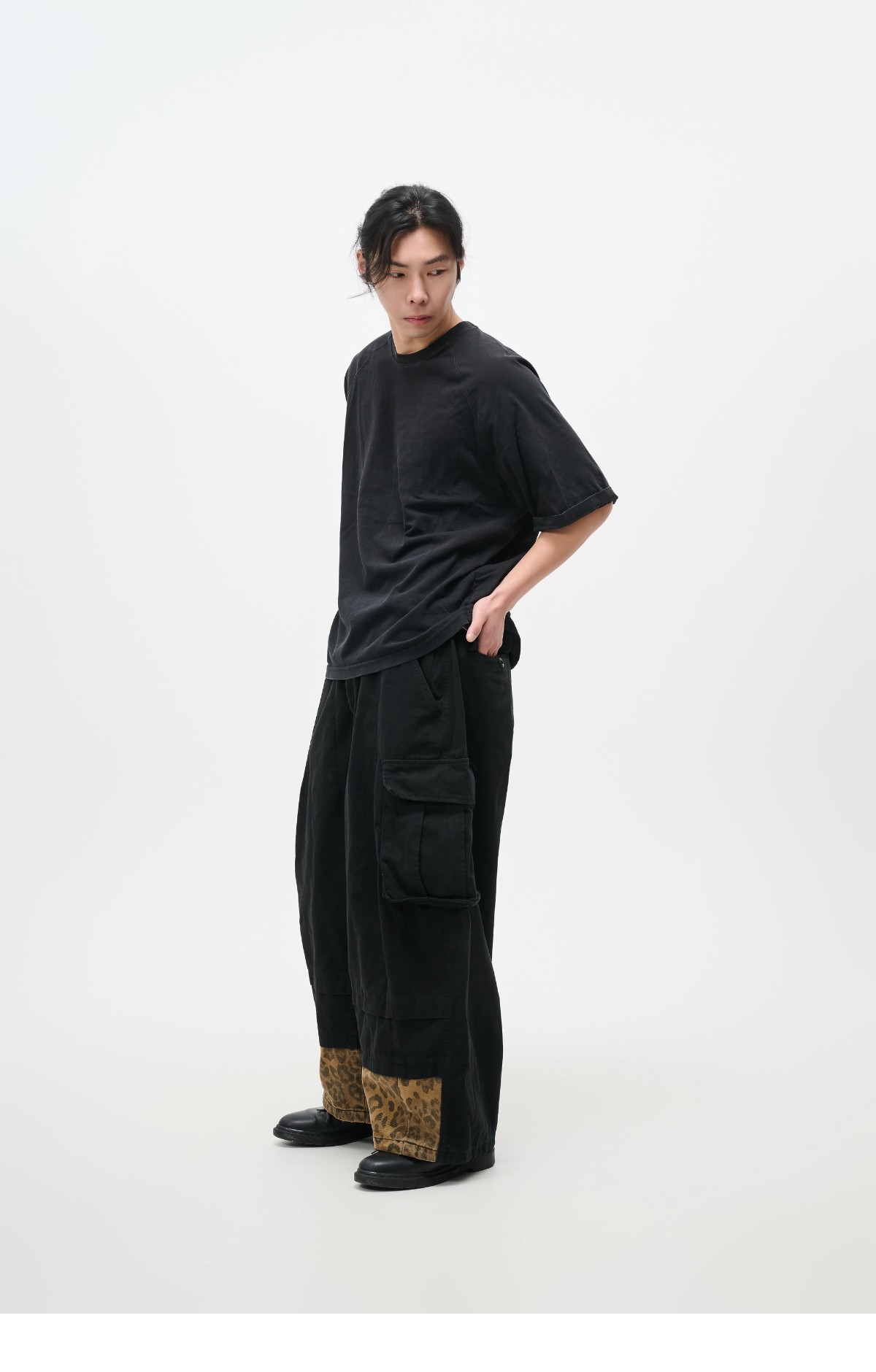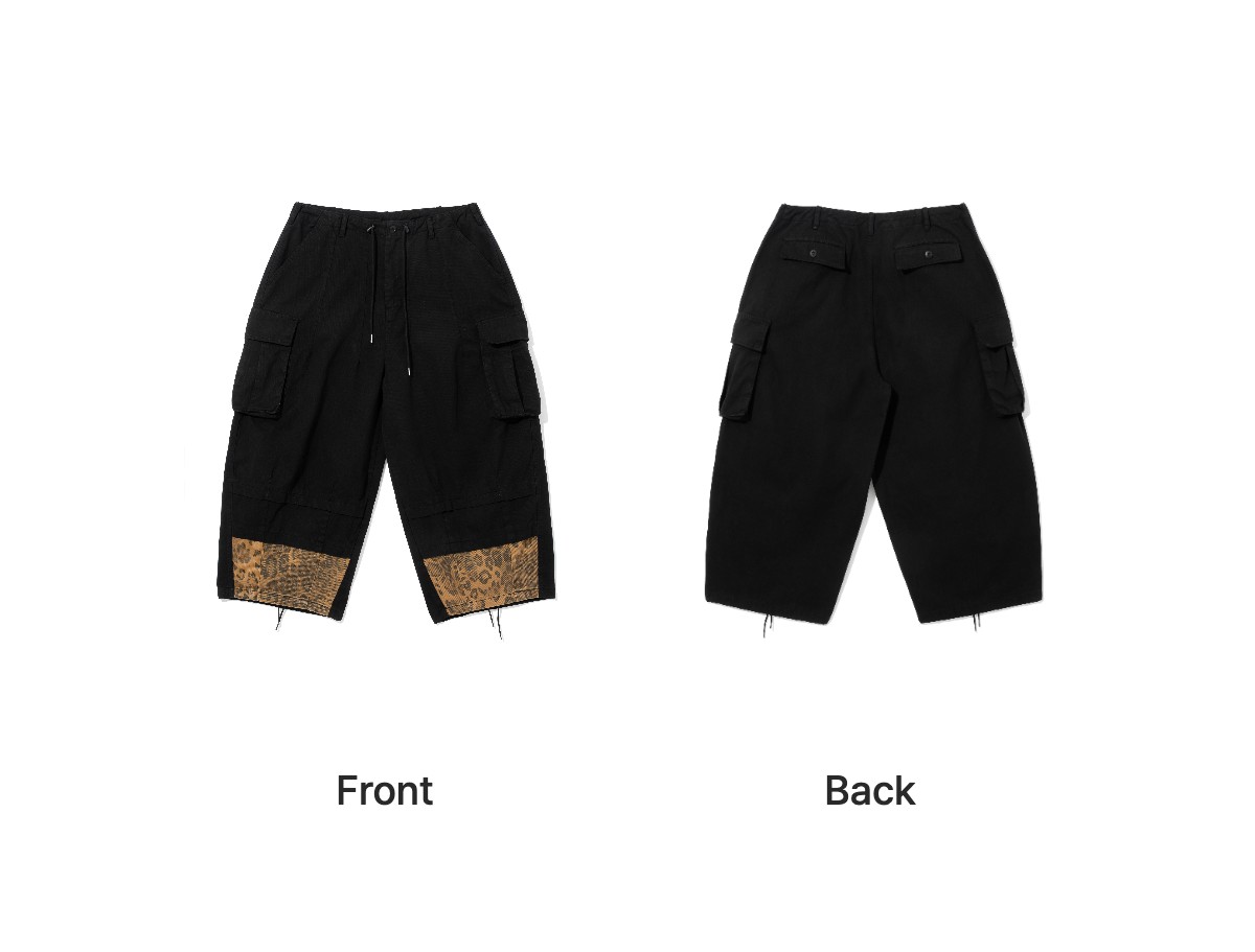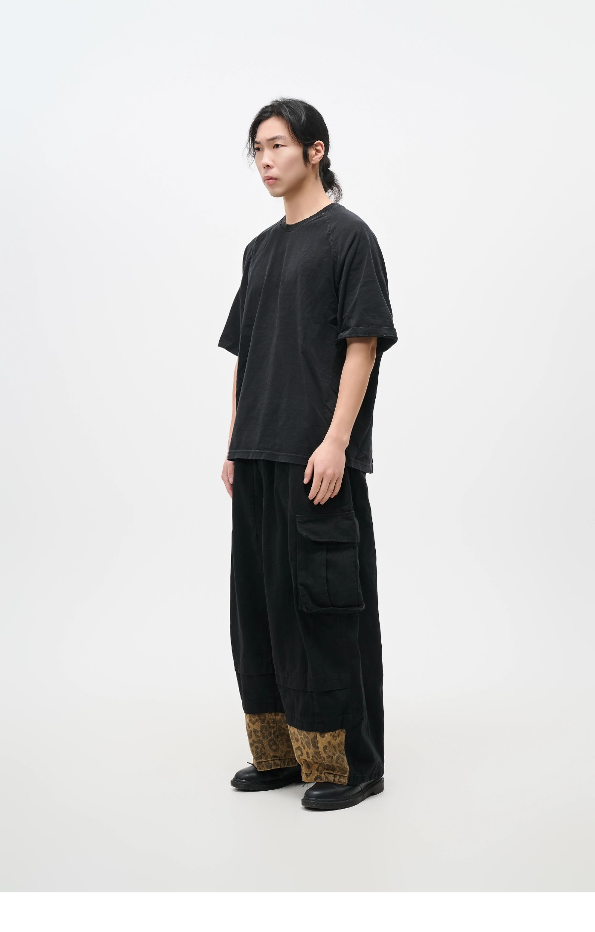 ヴィンテージ感とモダンな遊び心が融合した「3LAYED FATIGUE PANTS」。タフなコットン素材を使用し、両サイドのカーゴポケットや、ドローストリング仕様で機能性も抜群。最大の特徴は裾部分に施されたレオパード柄パネルで、ブラックのボディに映えるアクセントが効いています。ルーズフィットシルエットと、絶妙な丈感が、ストリートスタイルに程よい抜け感をプラス。スニーカーやブーツと合わせれば、一気に旬のアメカジスタイルが完成します。