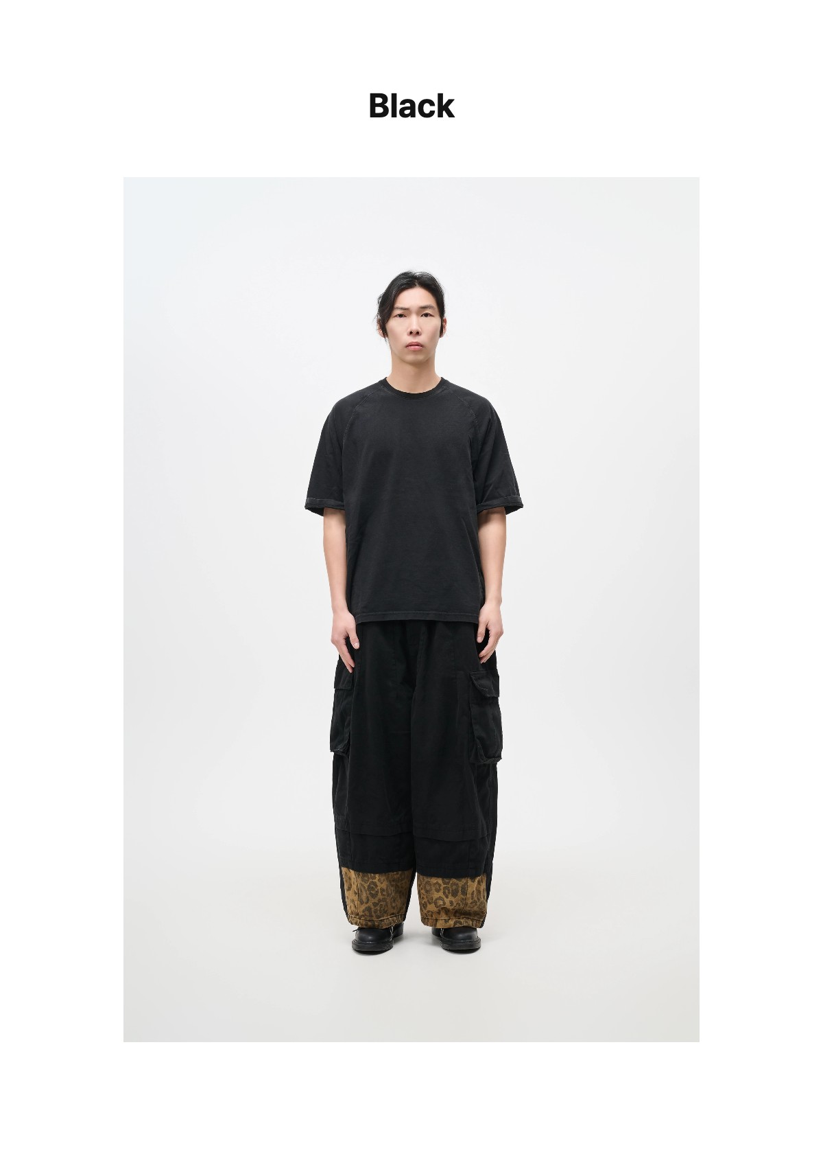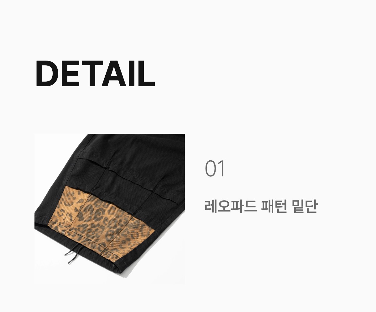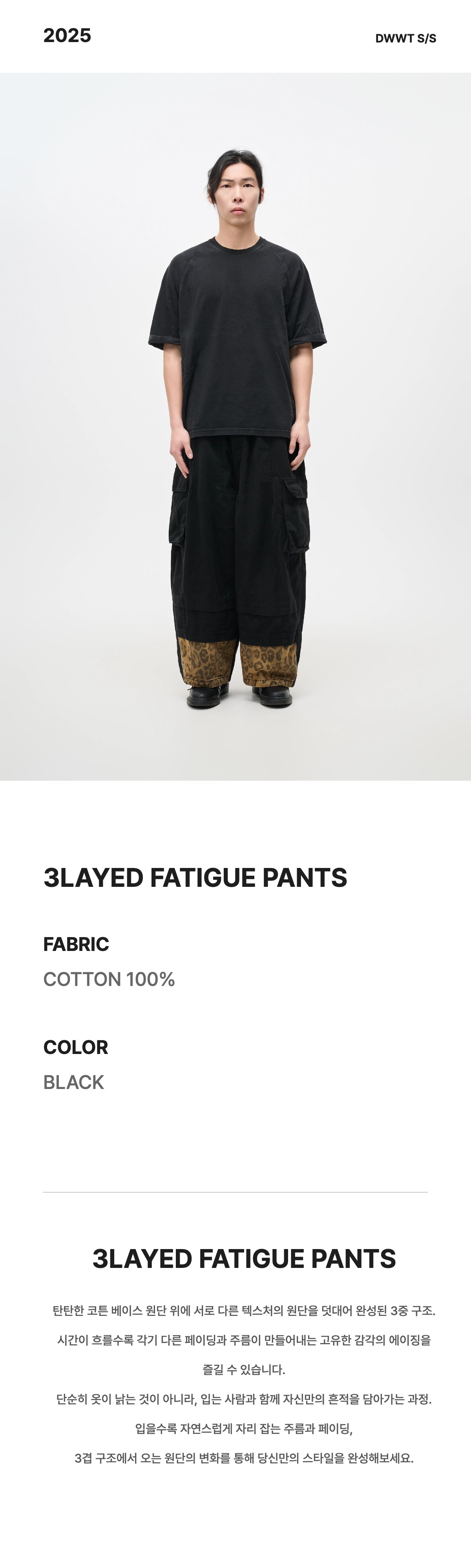 ヴィンテージ感とモダンな遊び心が融合した「3LAYED FATIGUE PANTS」。タフなコットン素材を使用し、両サイドのカーゴポケットや、ドローストリング仕様で機能性も抜群。最大の特徴は裾部分に施されたレオパード柄パネルで、ブラックのボディに映えるアクセントが効いています。ルーズフィットシルエットと、絶妙な丈感が、ストリートスタイルに程よい抜け感をプラス。スニーカーやブーツと合わせれば、一気に旬のアメカジスタイルが完成します。
