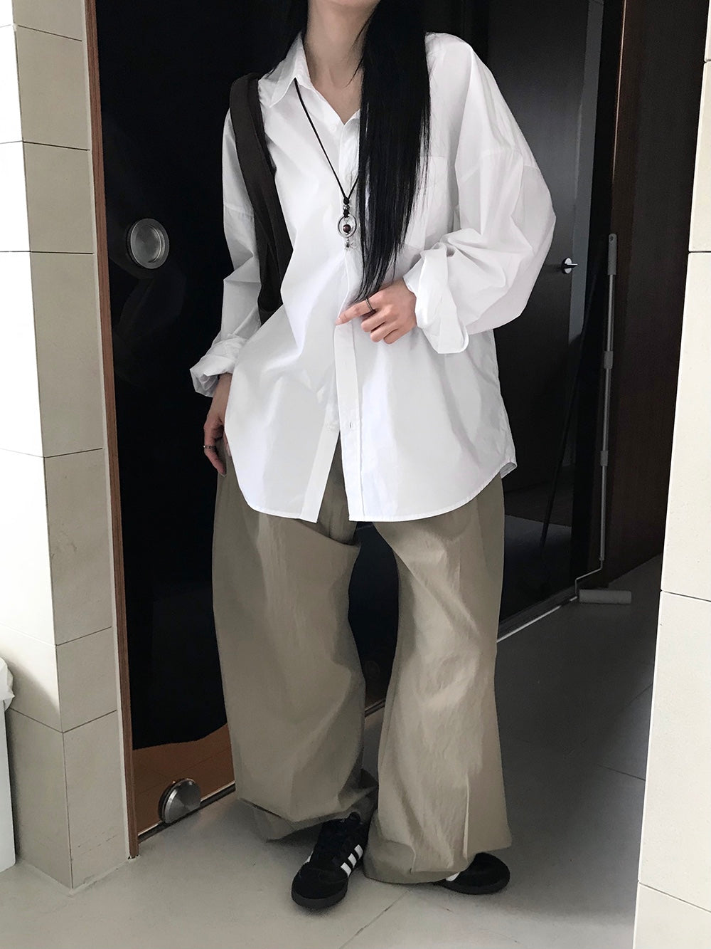 シンプルで洗練されたデザインのソリッドカラーシャツ。柔らかくハリのあるコットン生地を使用し、ゆったりとしたオーバーサイズシルエットで、モダンで都会的なスタイリングを演出します。フロントボタンと胸ポケットのミニマルなディテールがポイント。カジュアルからきれいめまで幅広く活躍する一枚です。