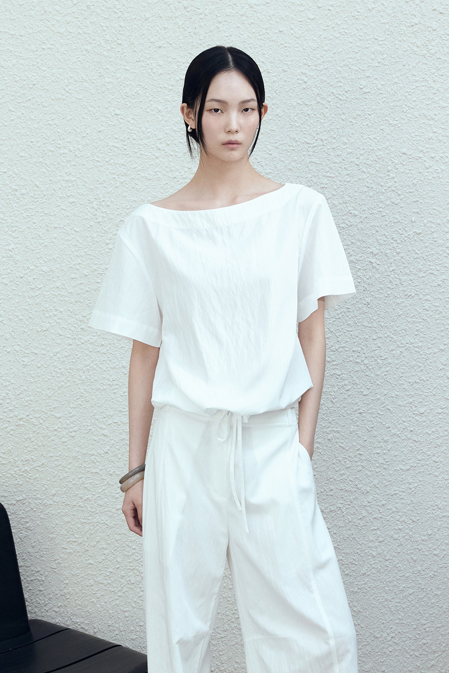 セミクロップ丈でカジュアルながらもボートネックラインが与えるフェミニンなムードが引き立つブラウスです。