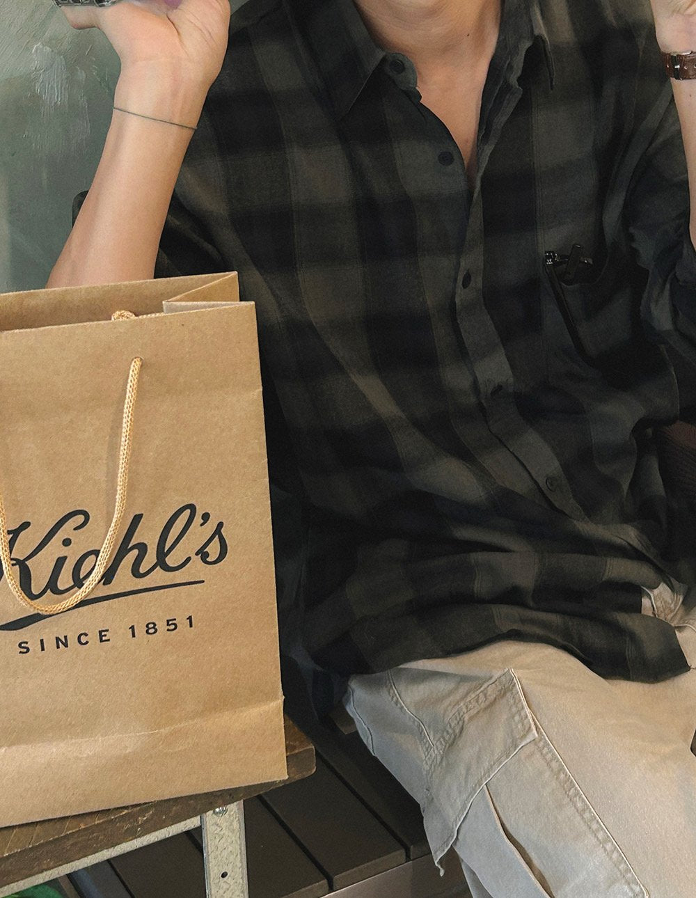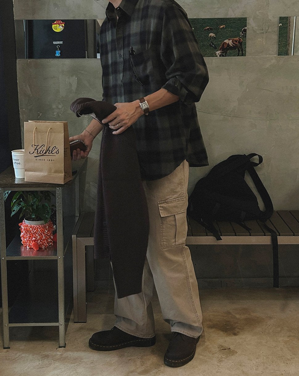 大柄のチェックを落ち着いたトーンでまとめたレギュラーカラーシャツ。