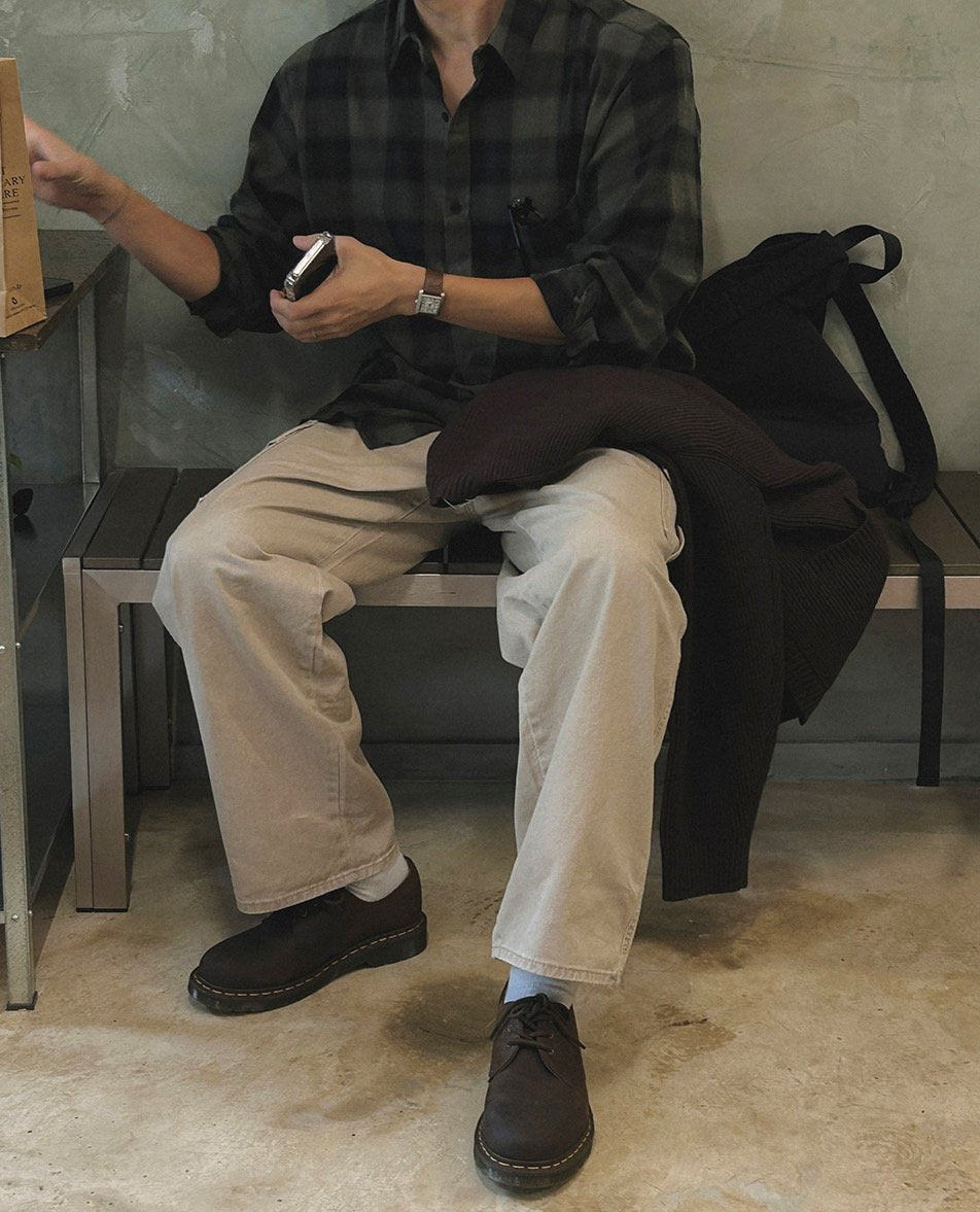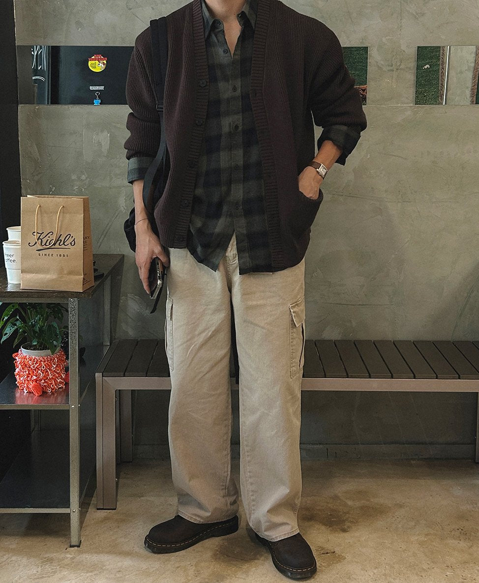 - 無地のカーディガンを羽織ってチェック柄を引き立てる。