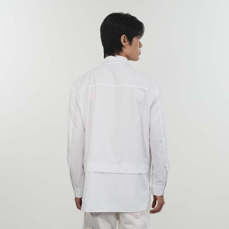 コットン100%のストライプ生地に、観覧車のデジタルプリントを施したオーバーサイズシャツ。ゆったりとしたシルエットで、印象的かつ快適な着心地を実現。