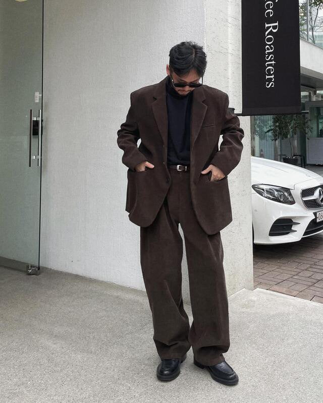 太畝コーデュロイで仕立てたジャケットとパンツのセットアップ。品のある起毛感が秋冬のムードを高め、ジャケットは程よいボックス〜レギュラーフィット、パンツはゆとりのあるワイドシルエットで、セットはもちろん単品使いでも着回せます。