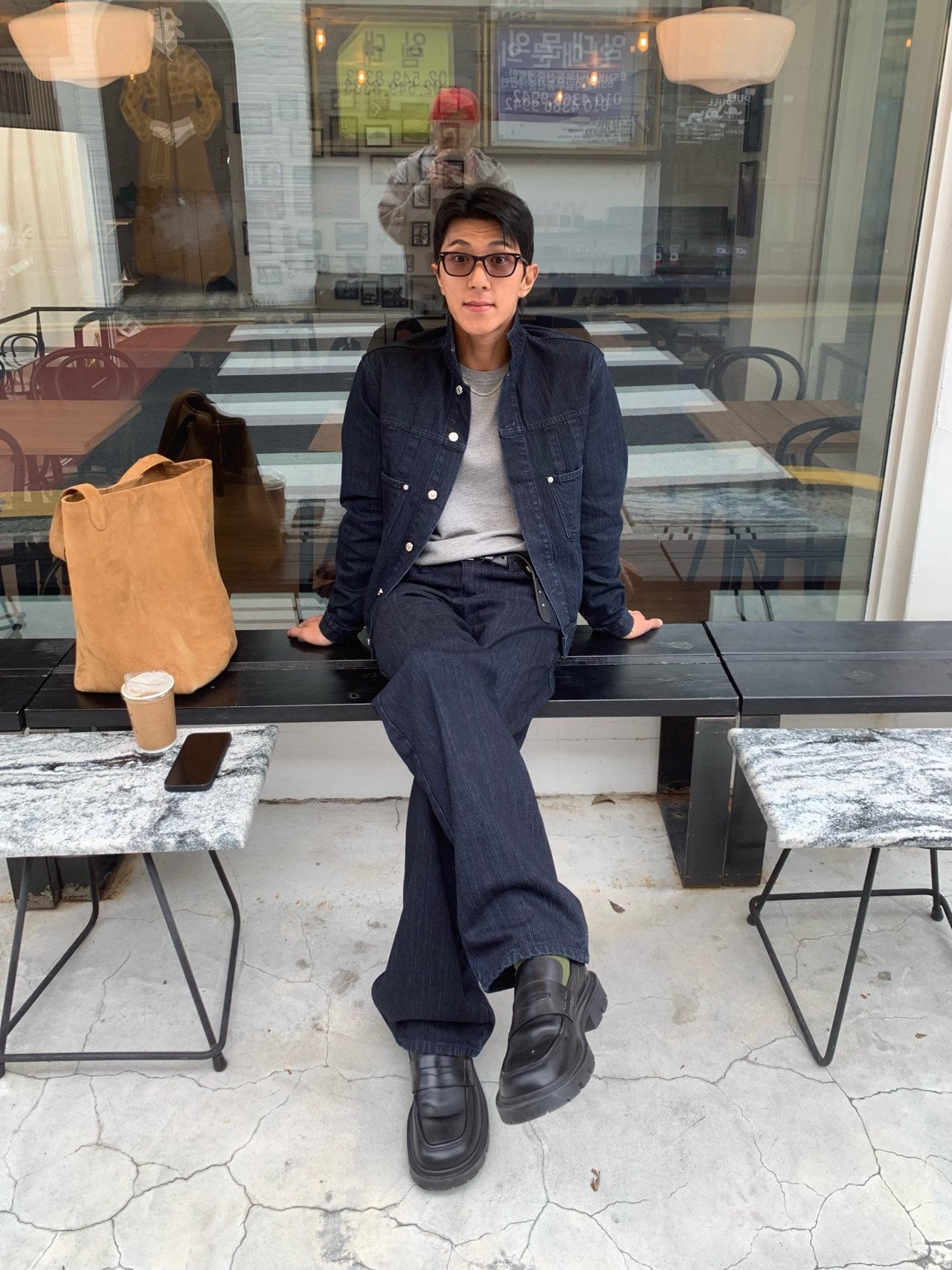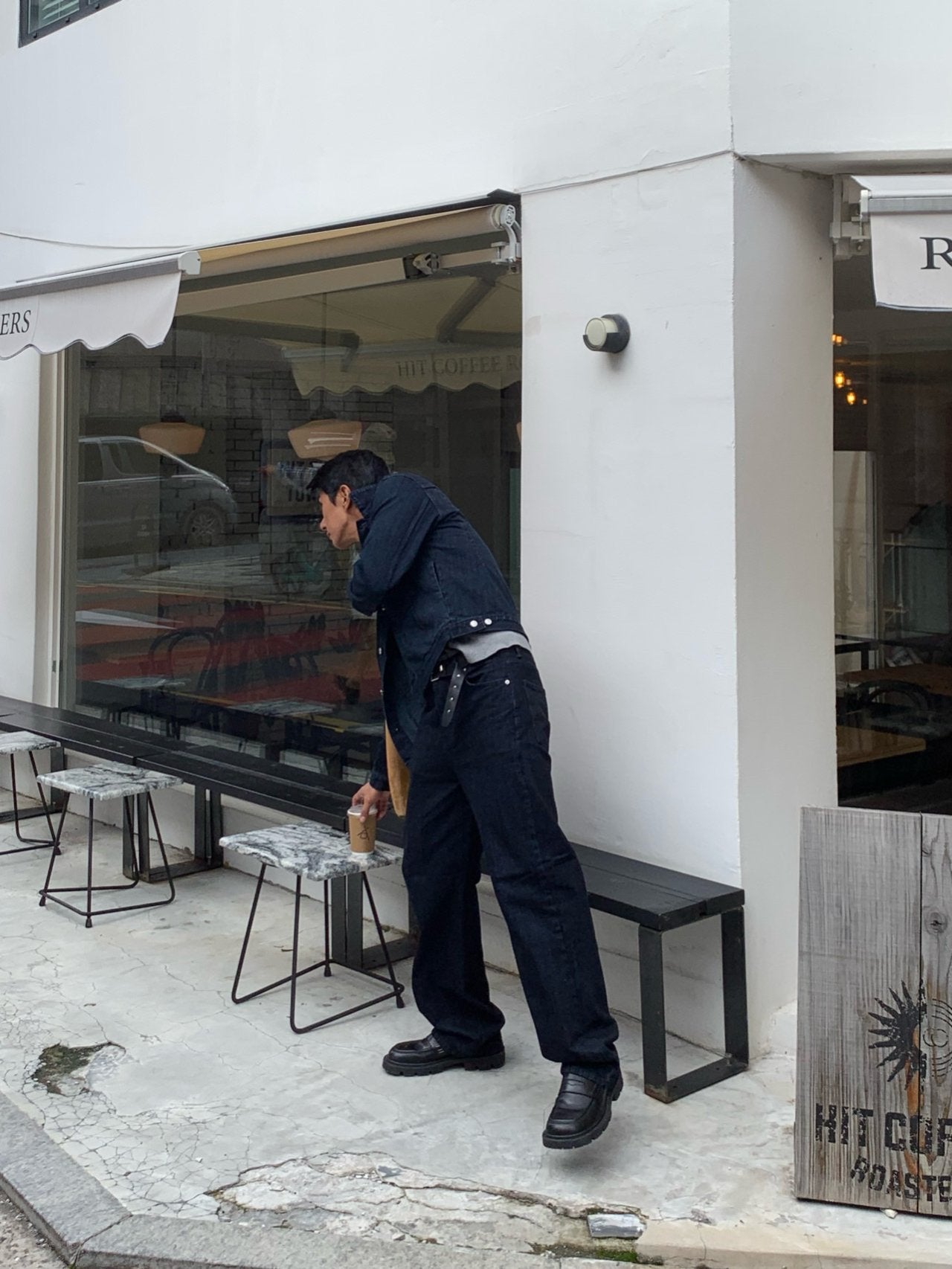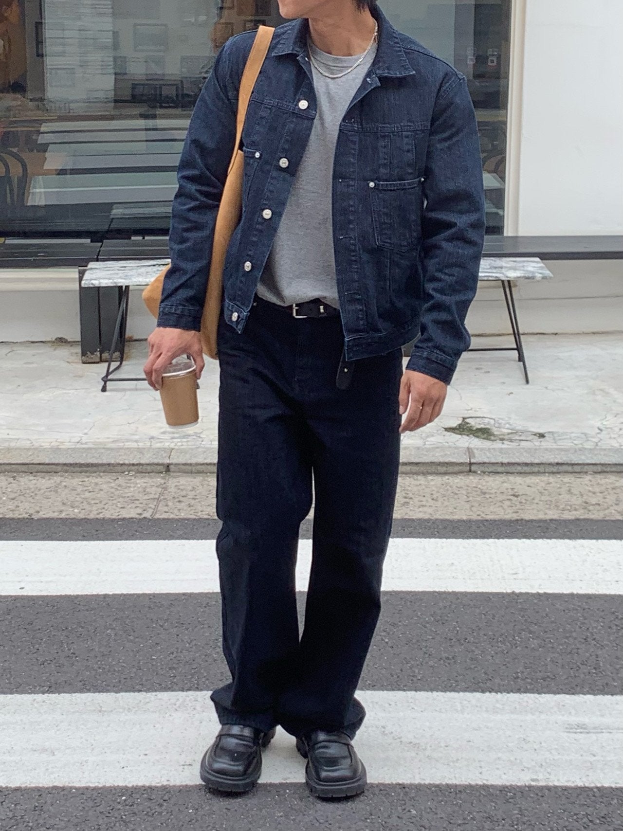 13オンスのコットンデニムに細かなストライプ調(골지)のテクスチャーを施した デニムジャケット&デニムパンツのセットアップ。深いネイビー(インディゴ)トーンで 上品かつ無骨なムードを両立。刻印メタルパーツと背面レザーパッチが存在感を添えます。