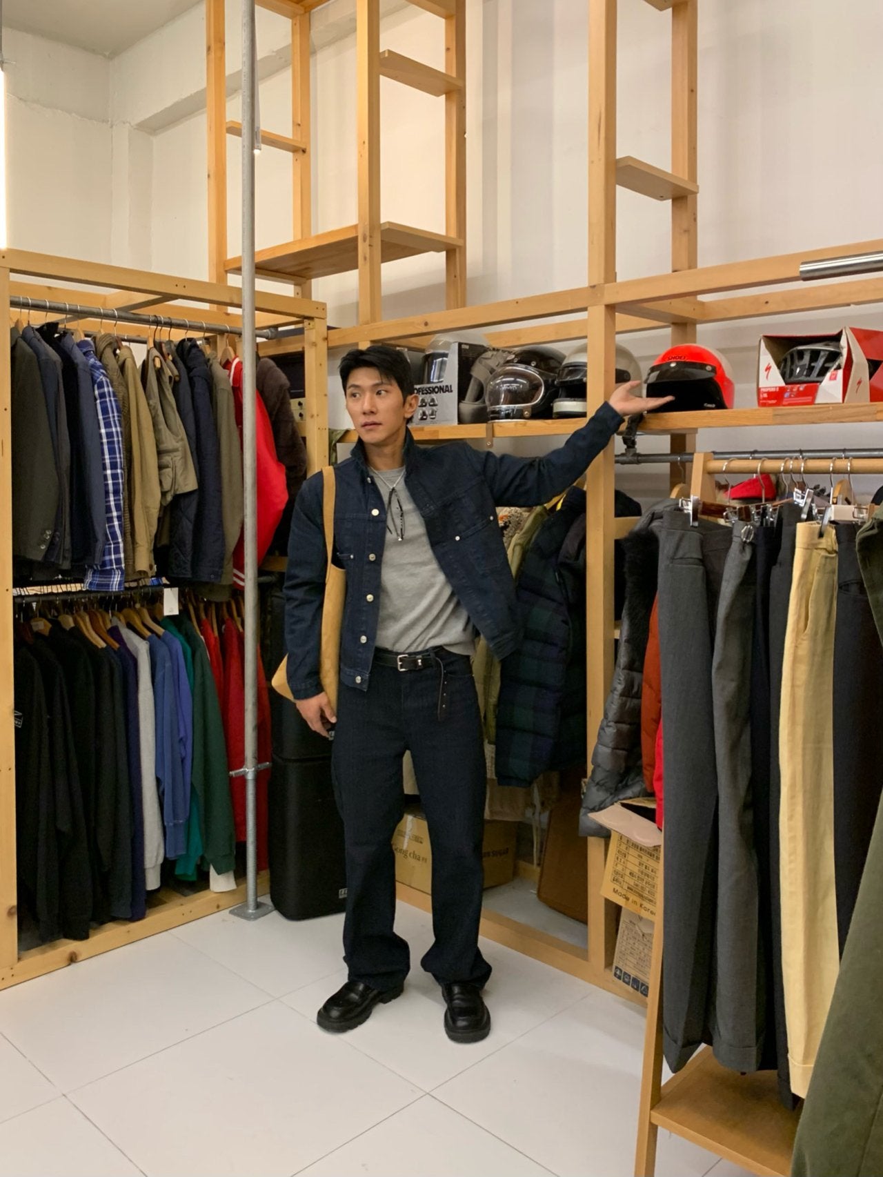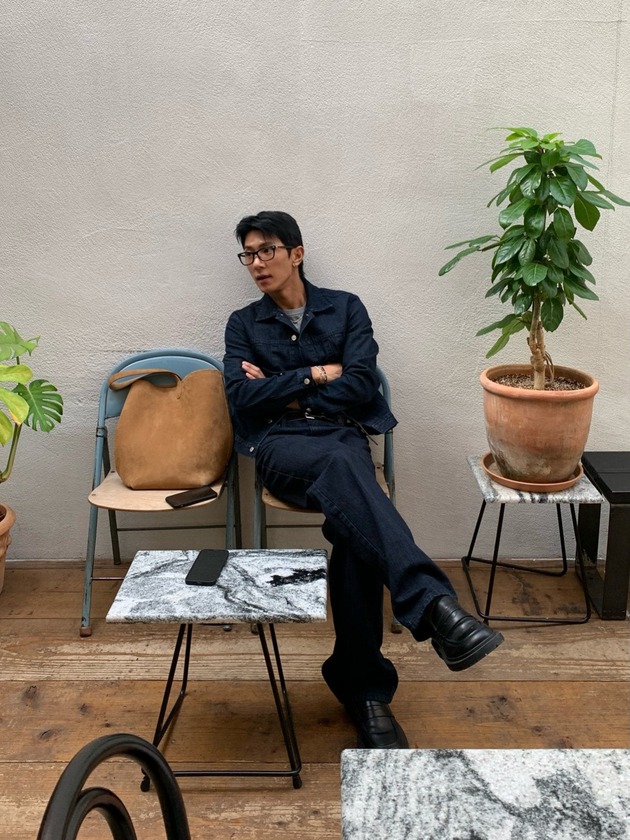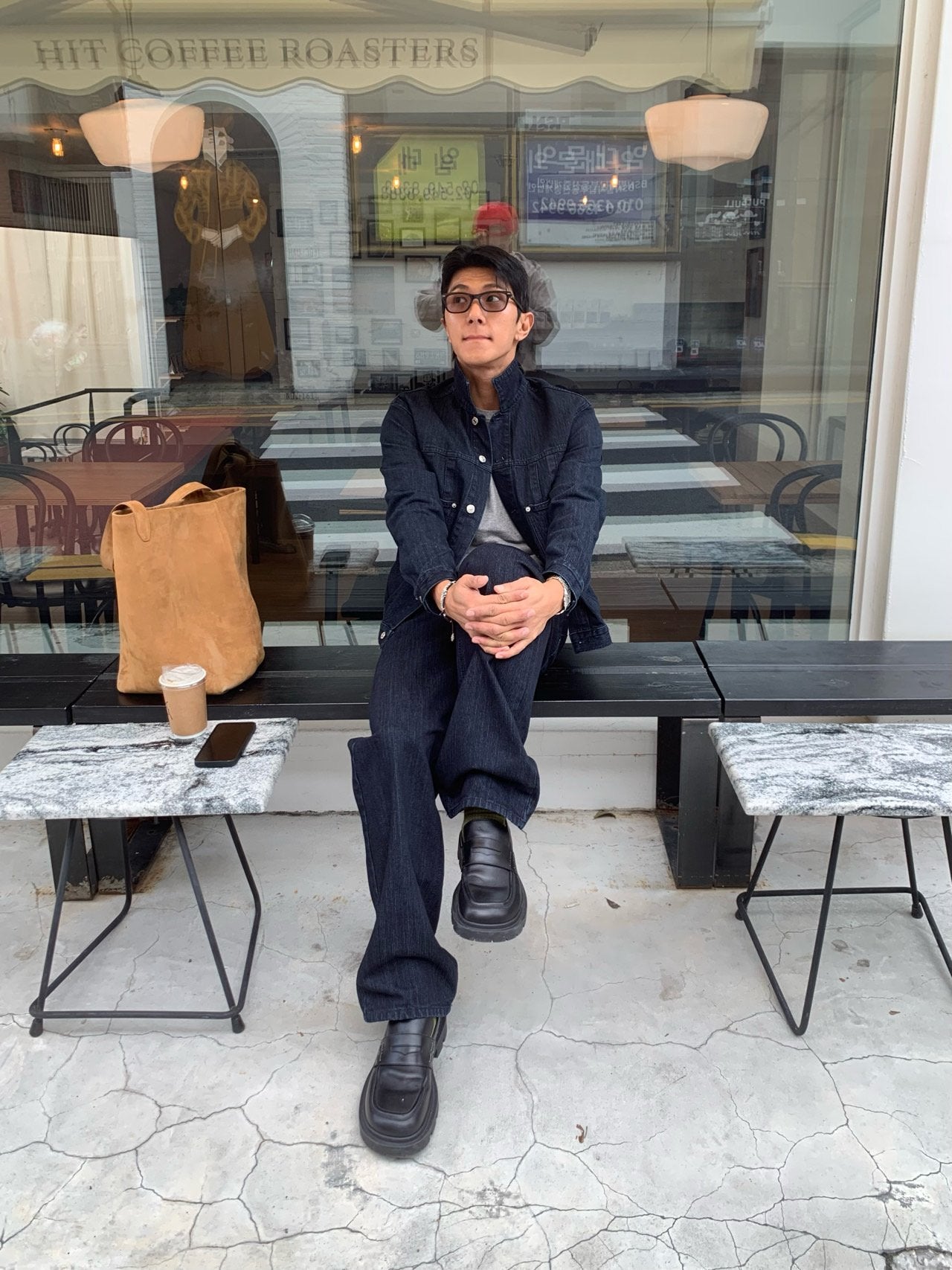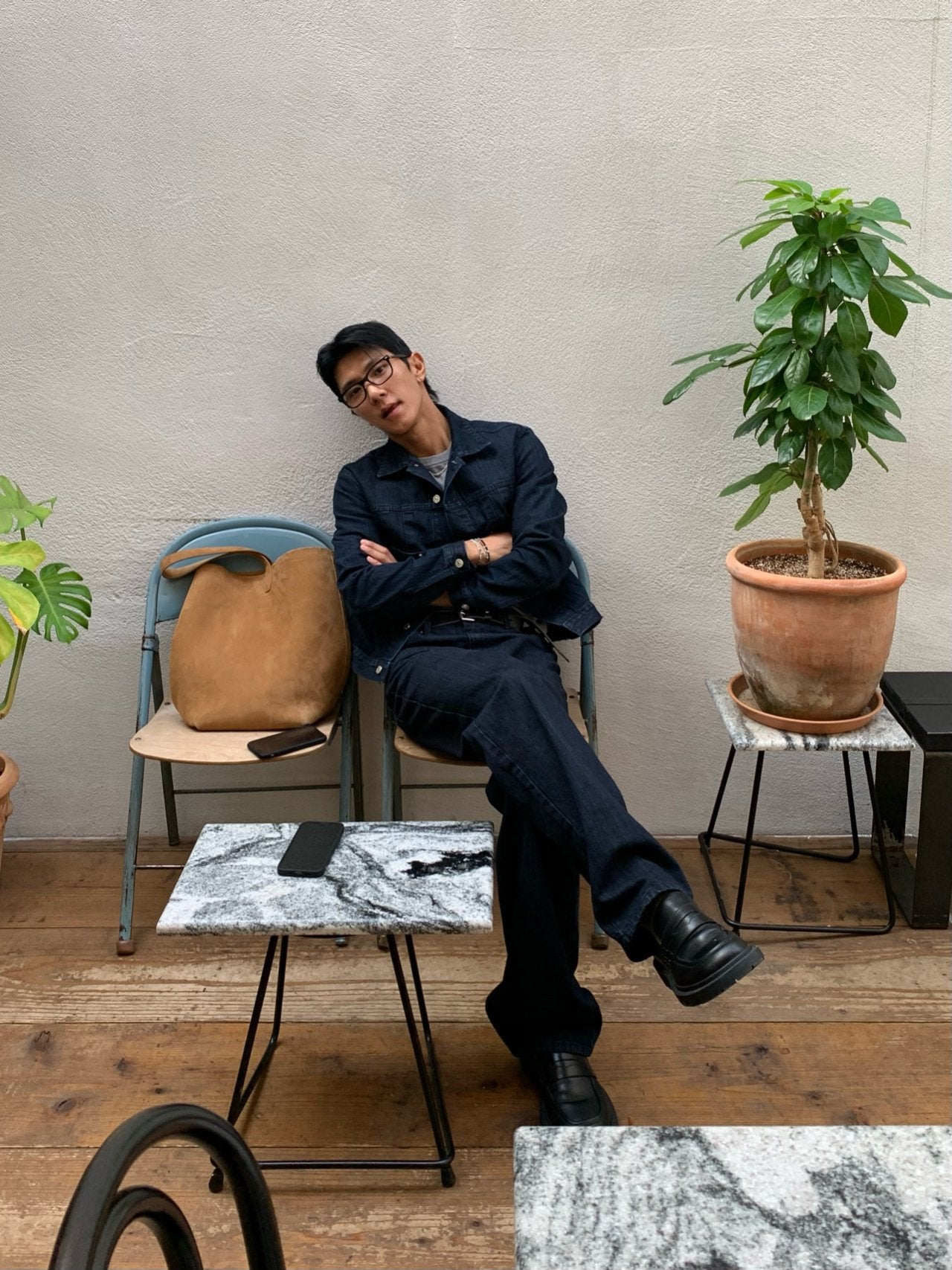 13オンスのコットンデニムに細かなストライプ調(골지)のテクスチャーを施した デニムジャケット&デニムパンツのセットアップ。深いネイビー(インディゴ)トーンで 上品かつ無骨なムードを両立。刻印メタルパーツと背面レザーパッチが存在感を添えます。