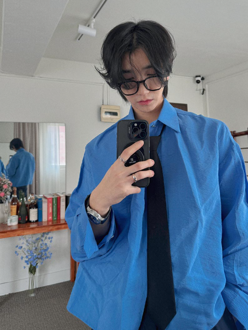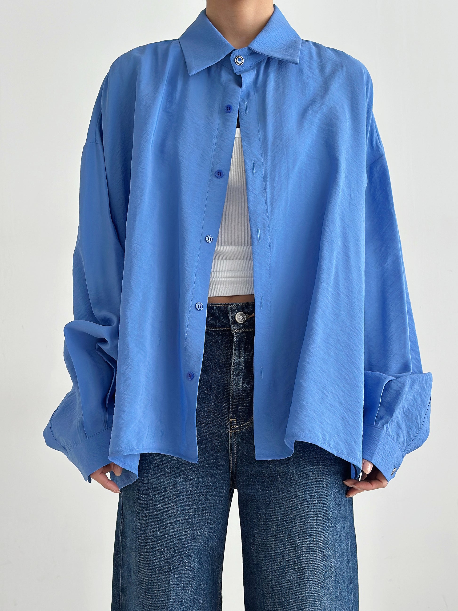光沢感のあるナイロンライクな質感が目を惹く、オーバーサイズのロングスリーブシャツ。滑らかで軽やかな生地感が春夏のスタイリングに最適で、ボタンを閉めれば洗練されたミニマルルックに、羽織れば抜け感のあるレイヤードスタイルに。