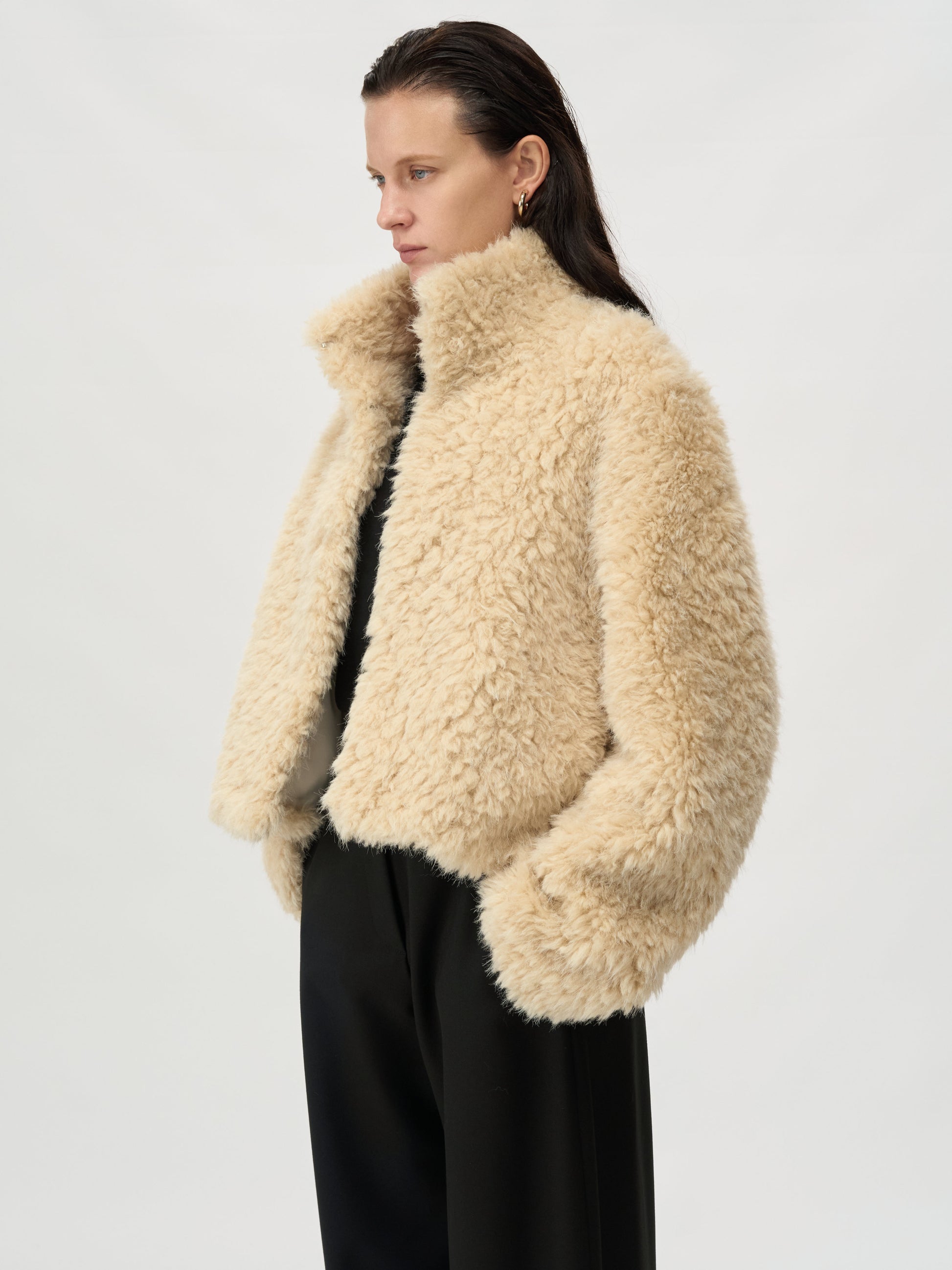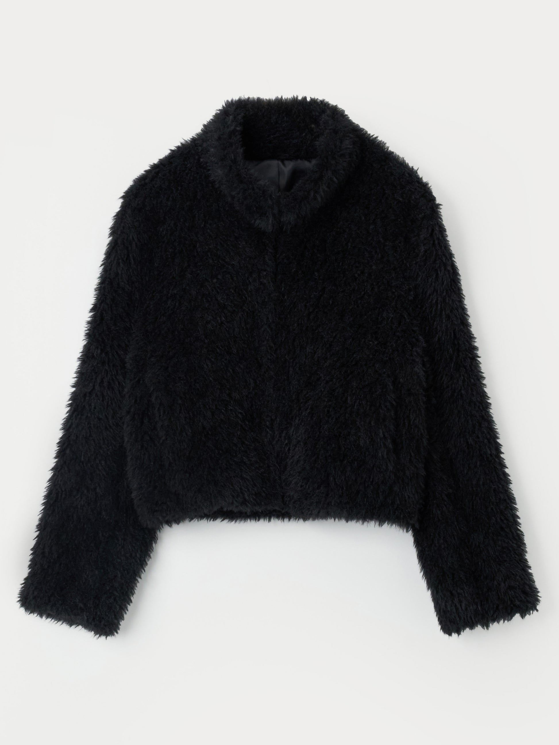 リアルファーのようなリュクスな質感を現代的に表現した、フェイクシアリングファーアウター。