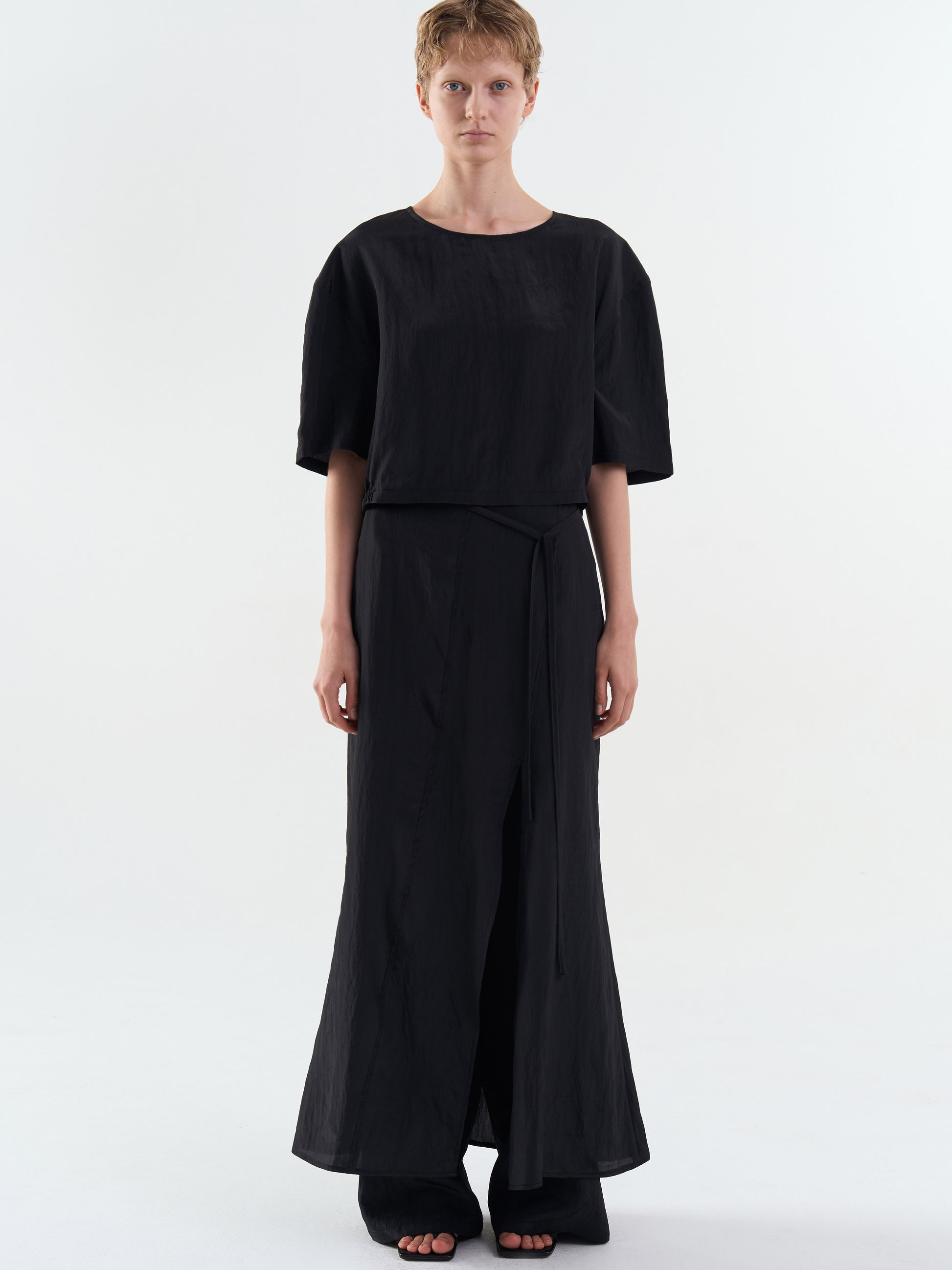 優雅なマーメイドシルエットが女性らしいラインを美しく整え、斜めにしたスリットディテールが歩くたびに軽やかな動きを演出します。ウエスト