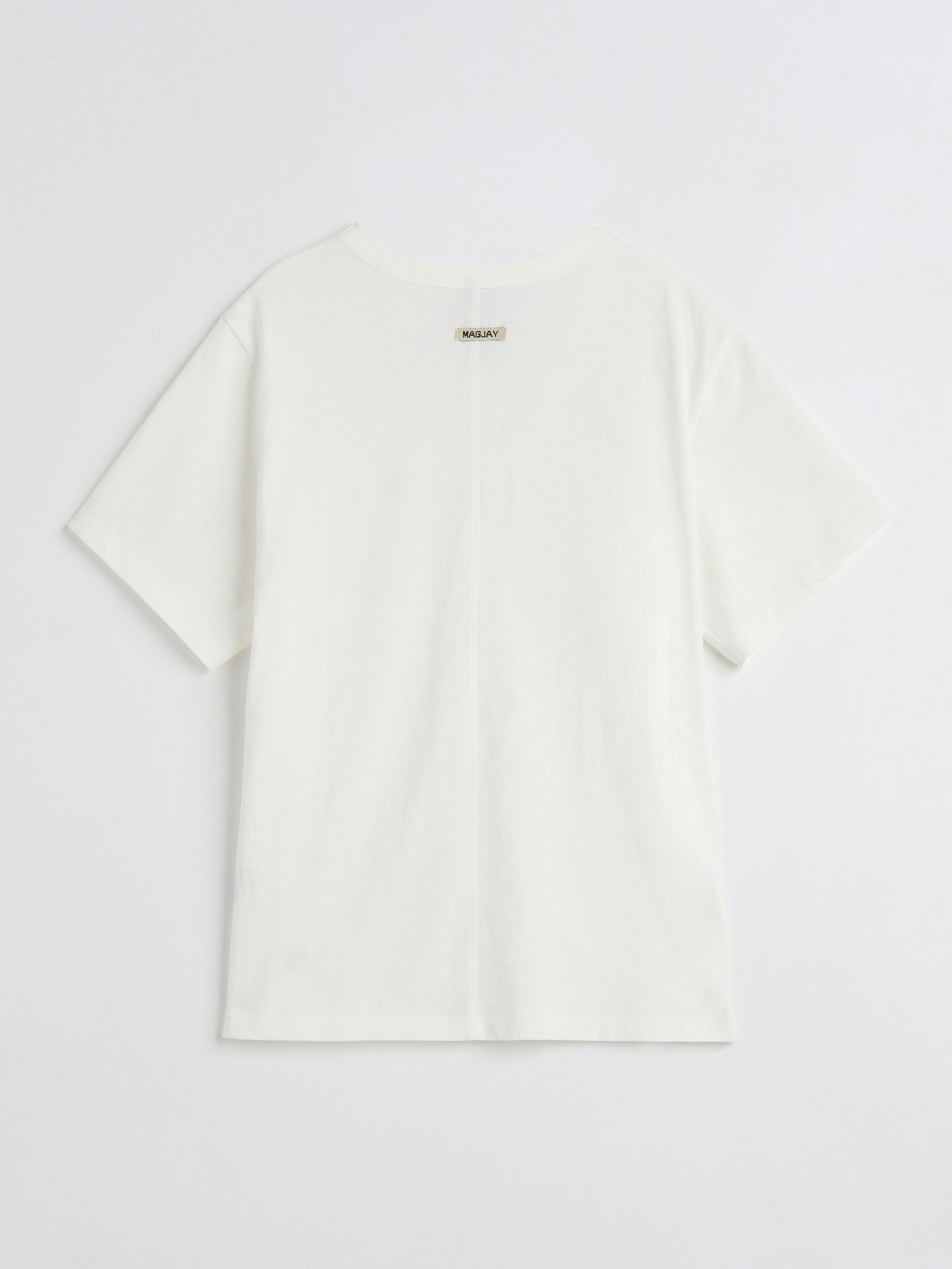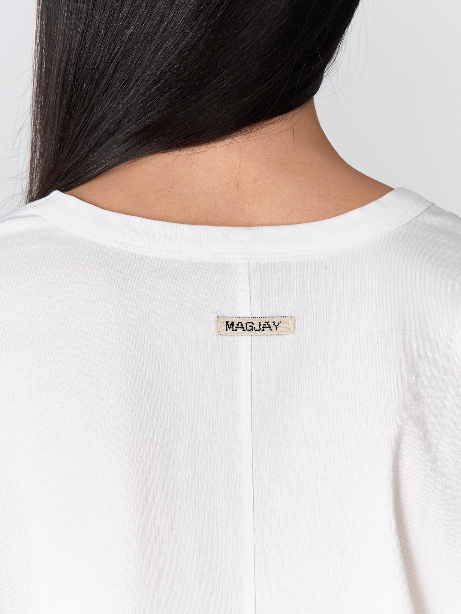 コットン100%素材で仕立てたソフトな肌触りのUネックTシャツ。袖口と裾はダブルステッチ仕上げで、シンプルながらしっかりとした構造。MAGJAYのニットラベルが後ろに施され、ブランドの個性が光る一枚です。