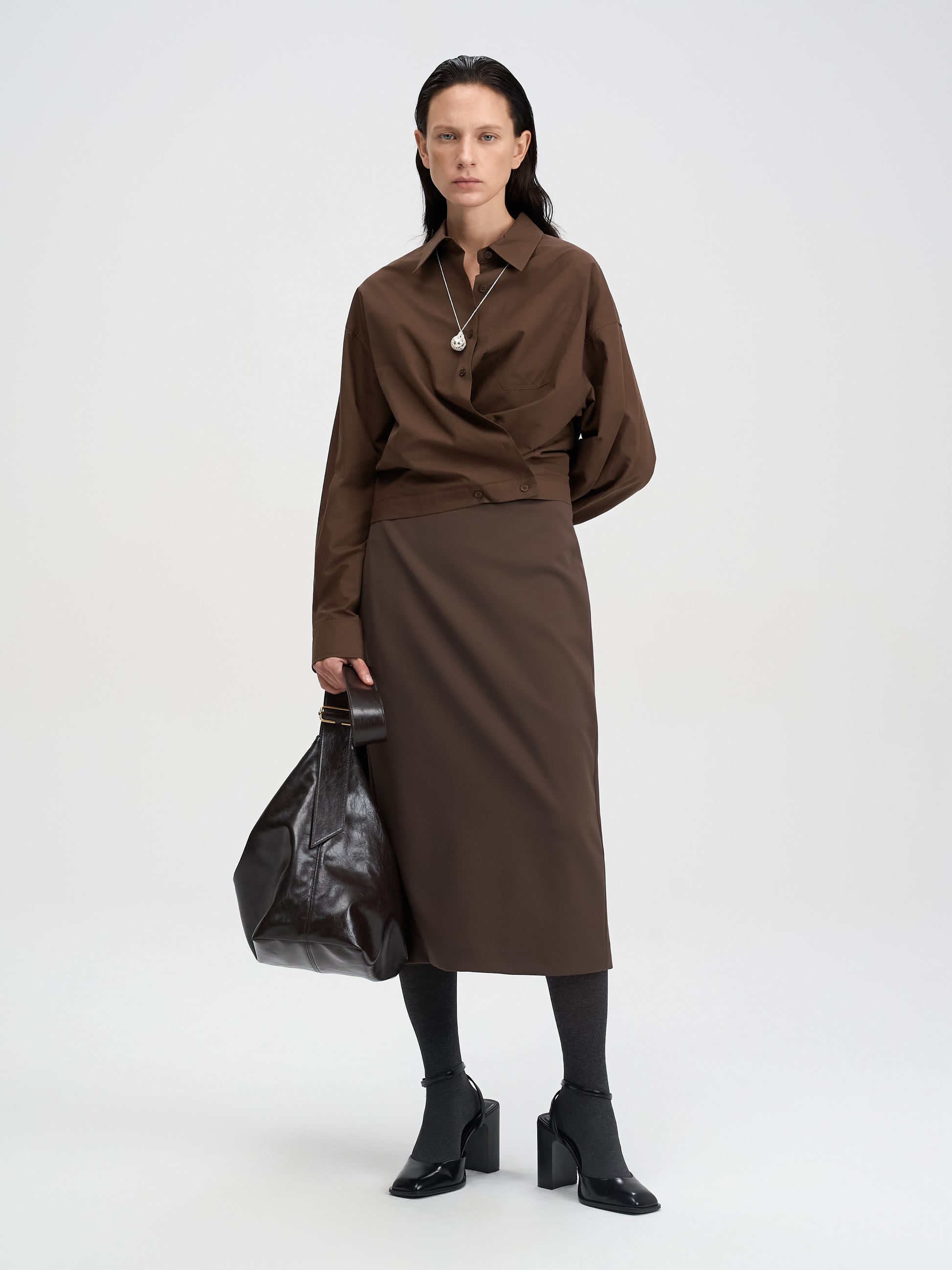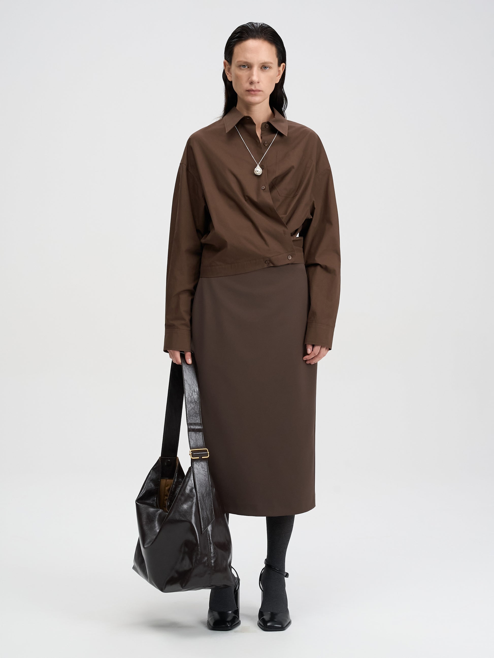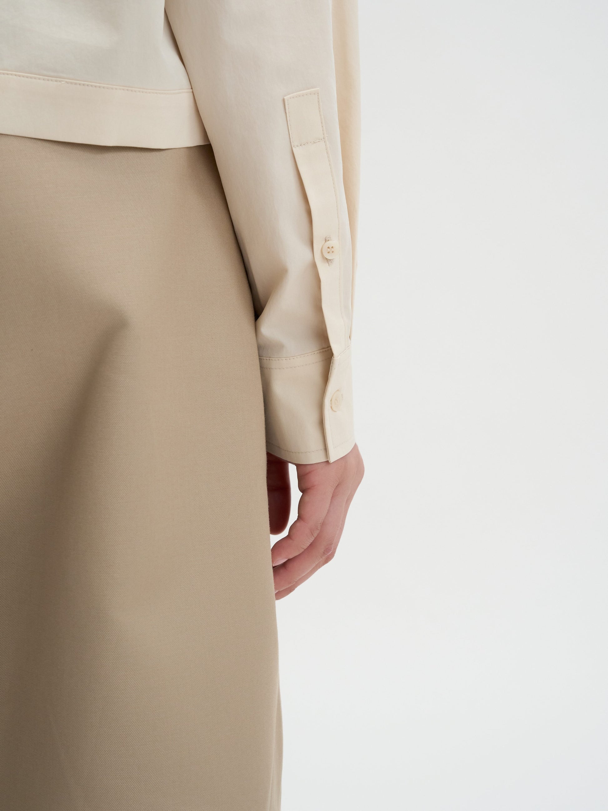 前身頃のクロスディテールは、ボタンの留め方で印象が変わり、閉めて上品に、開けてカジュアルにと多様な表情を演出します。