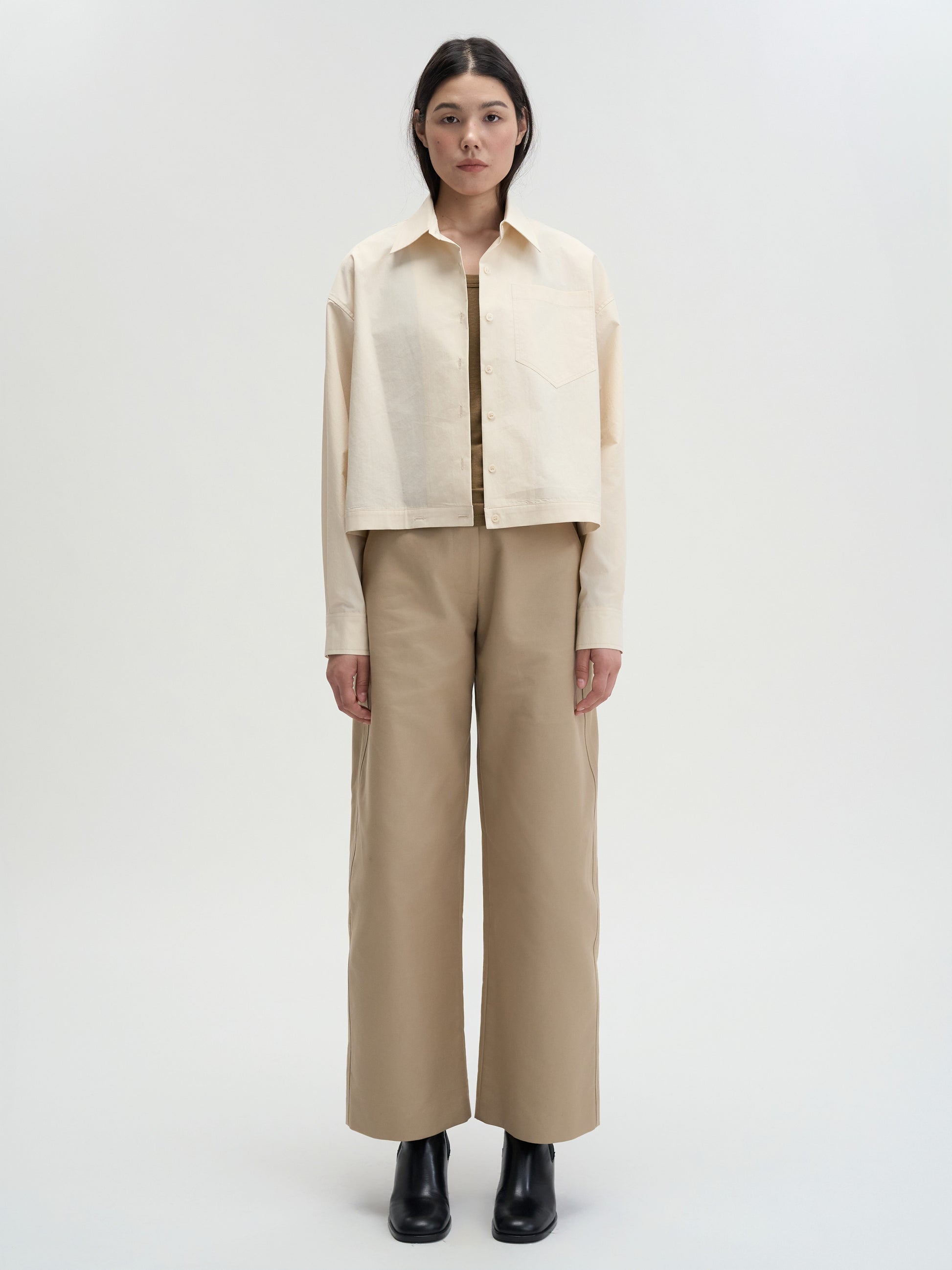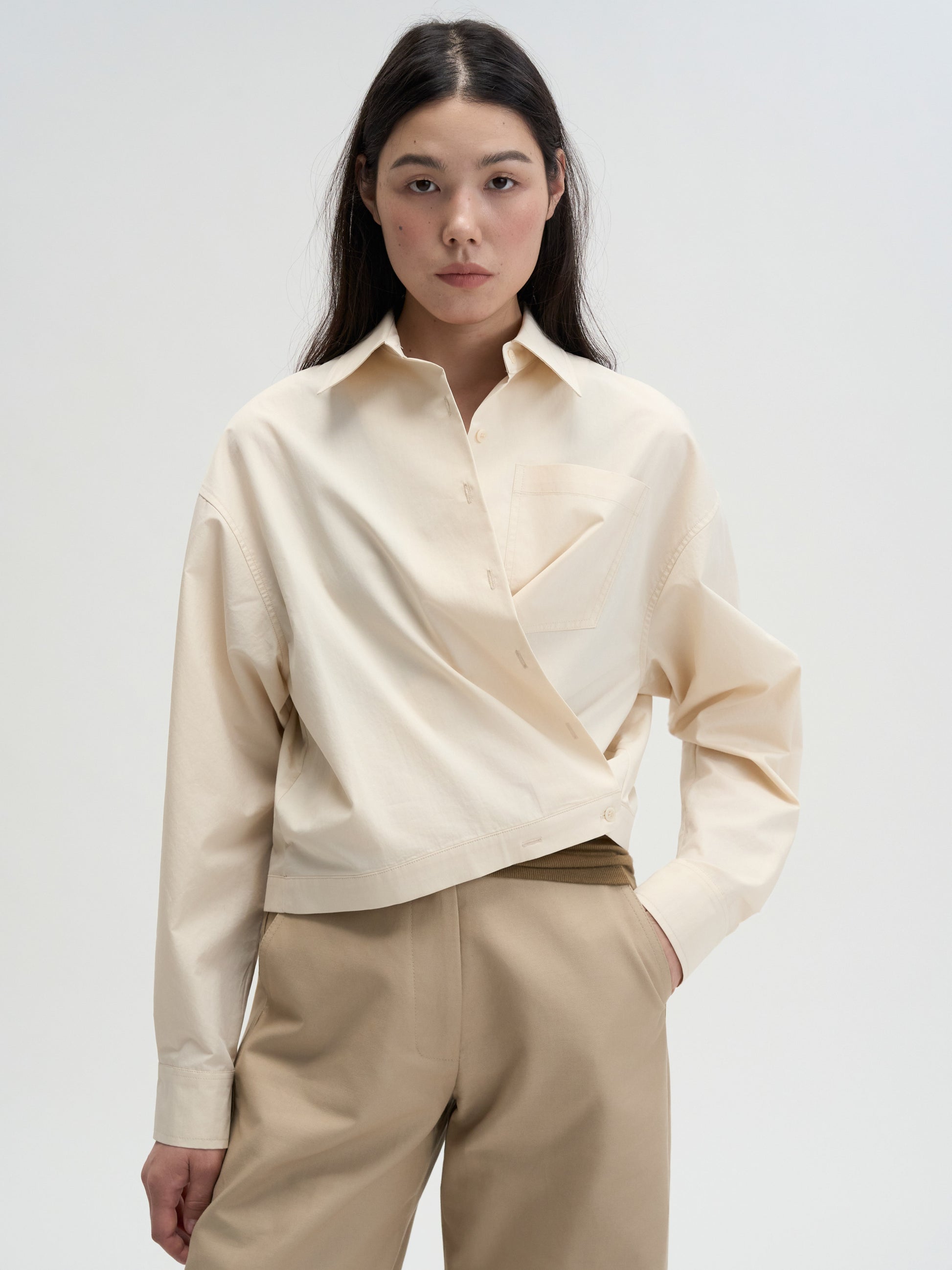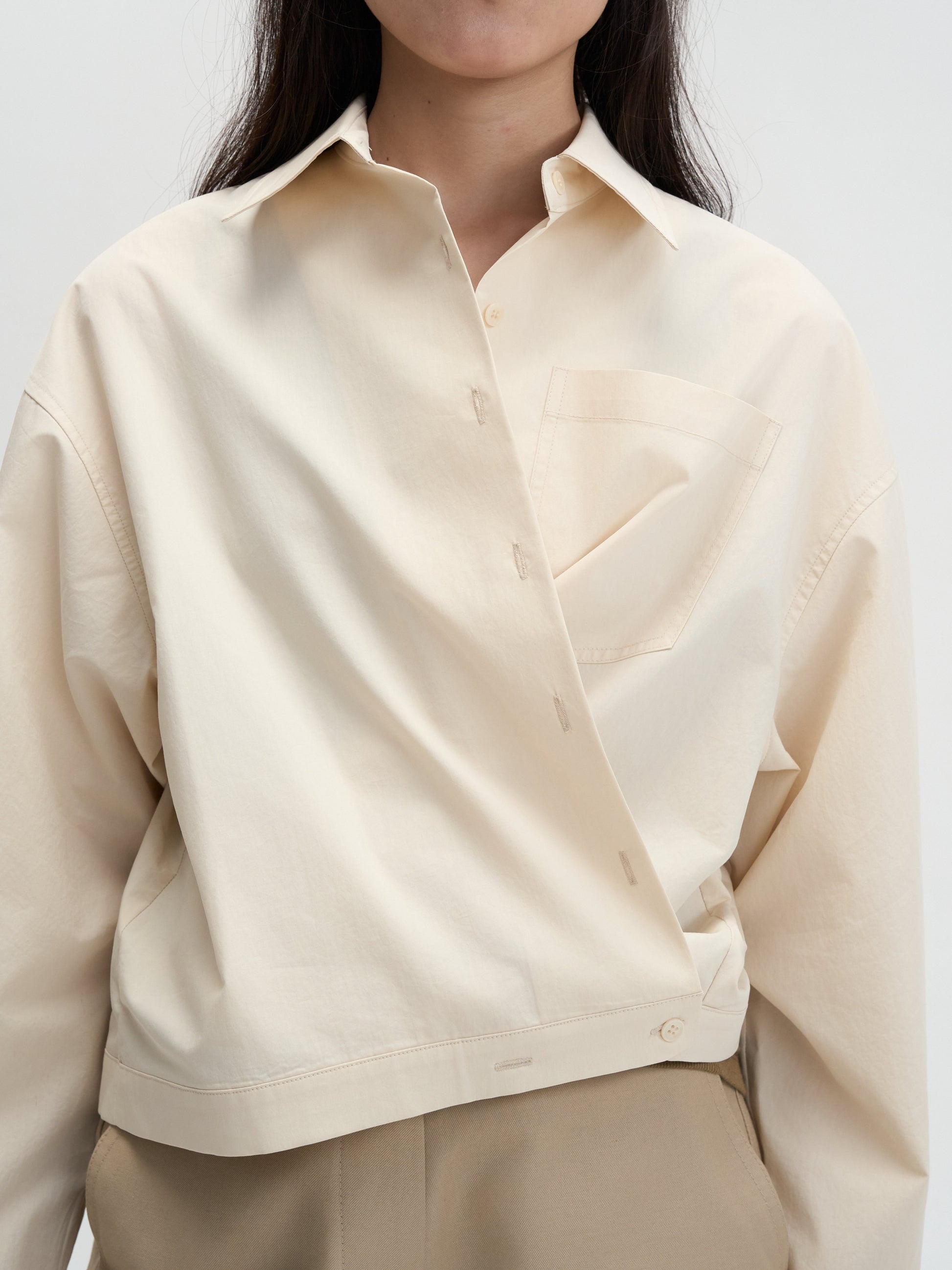 MAGJAYのシグネチャーライン「UNO LINE」から登場した、洗練と実用性を兼ね備えたクロップドシャツ。