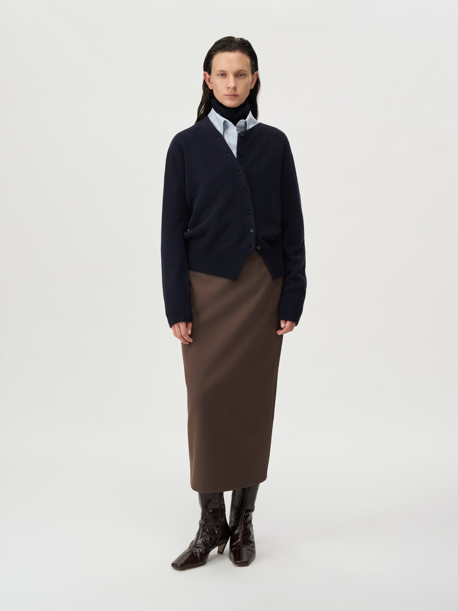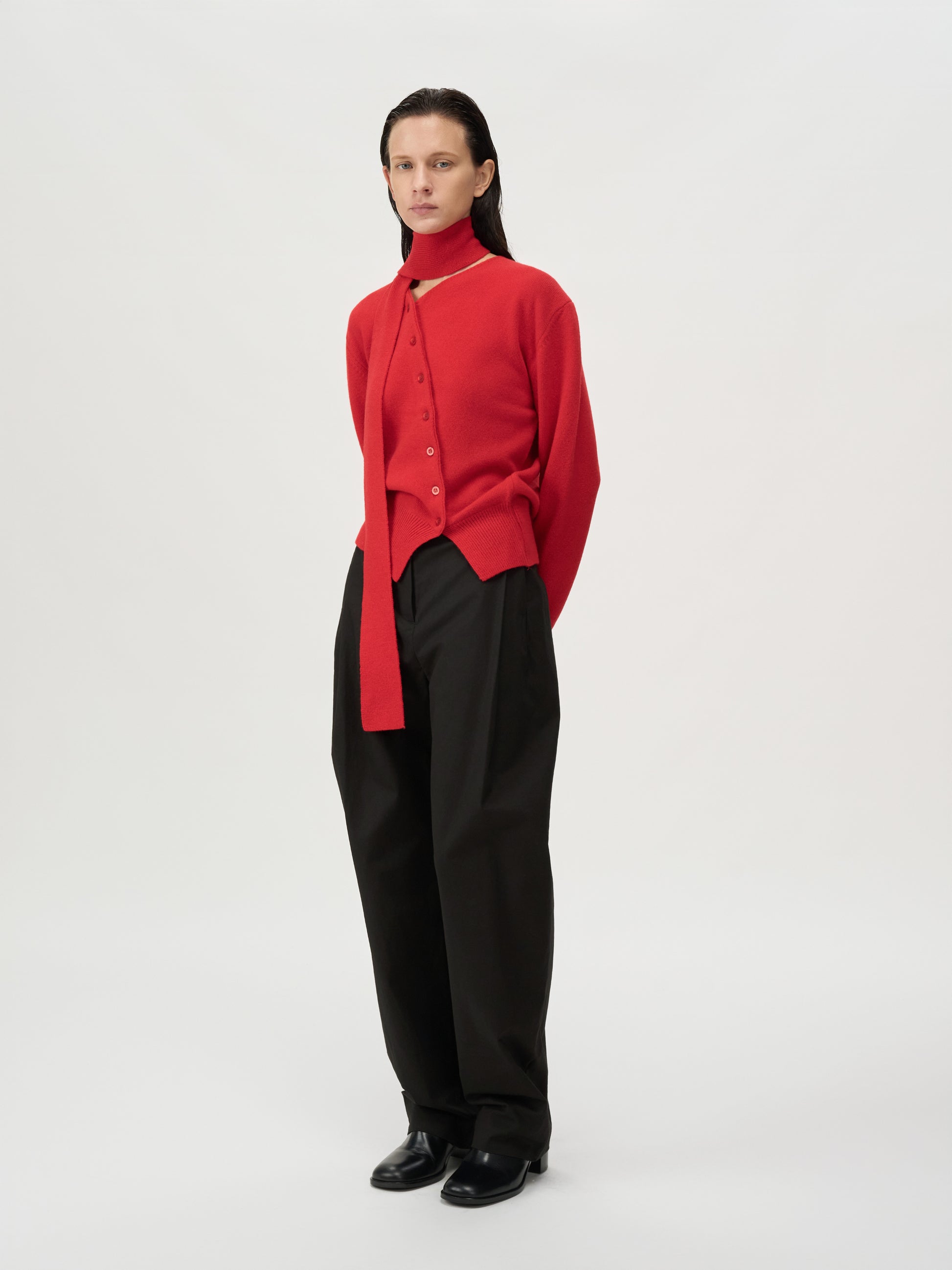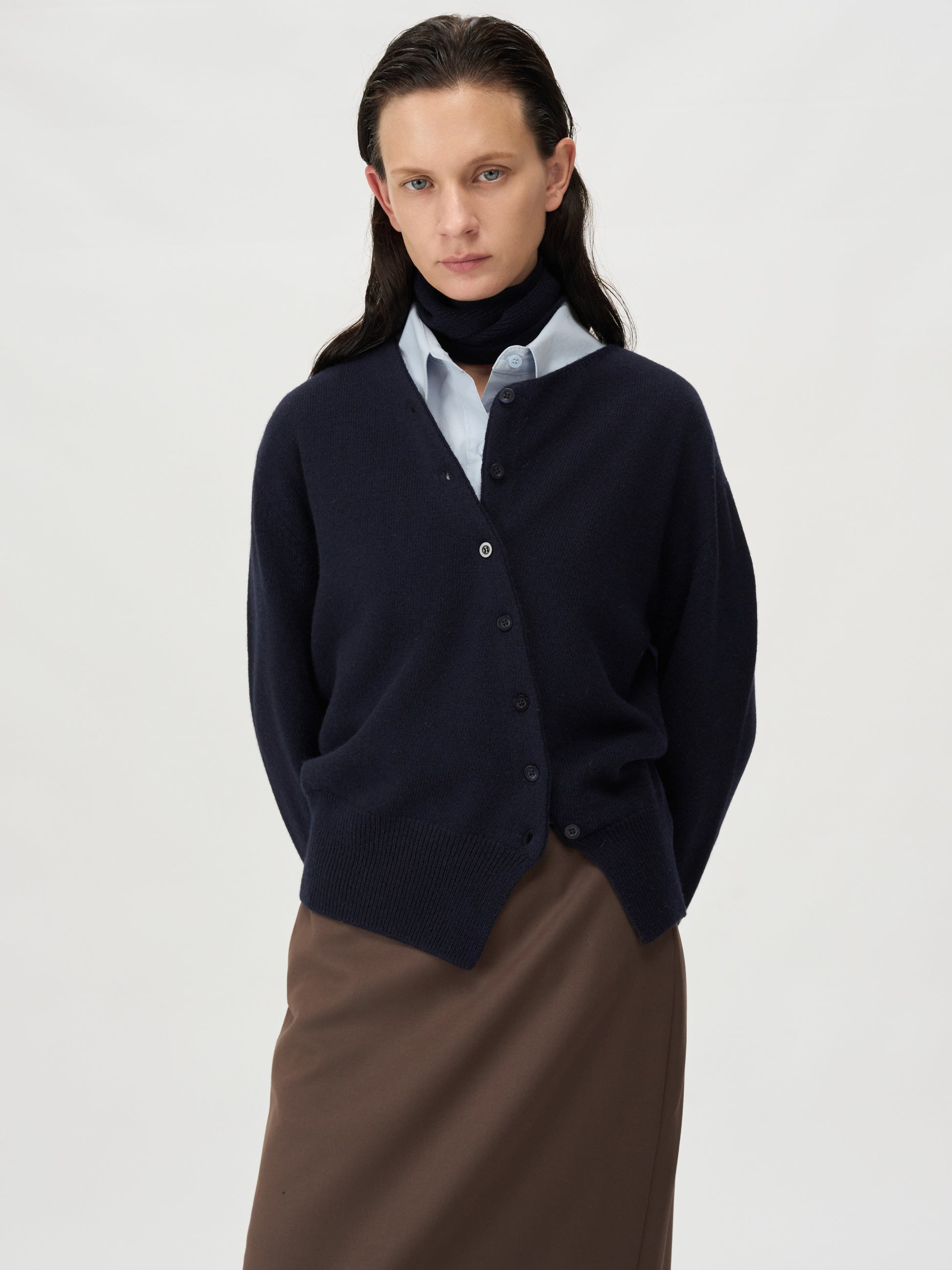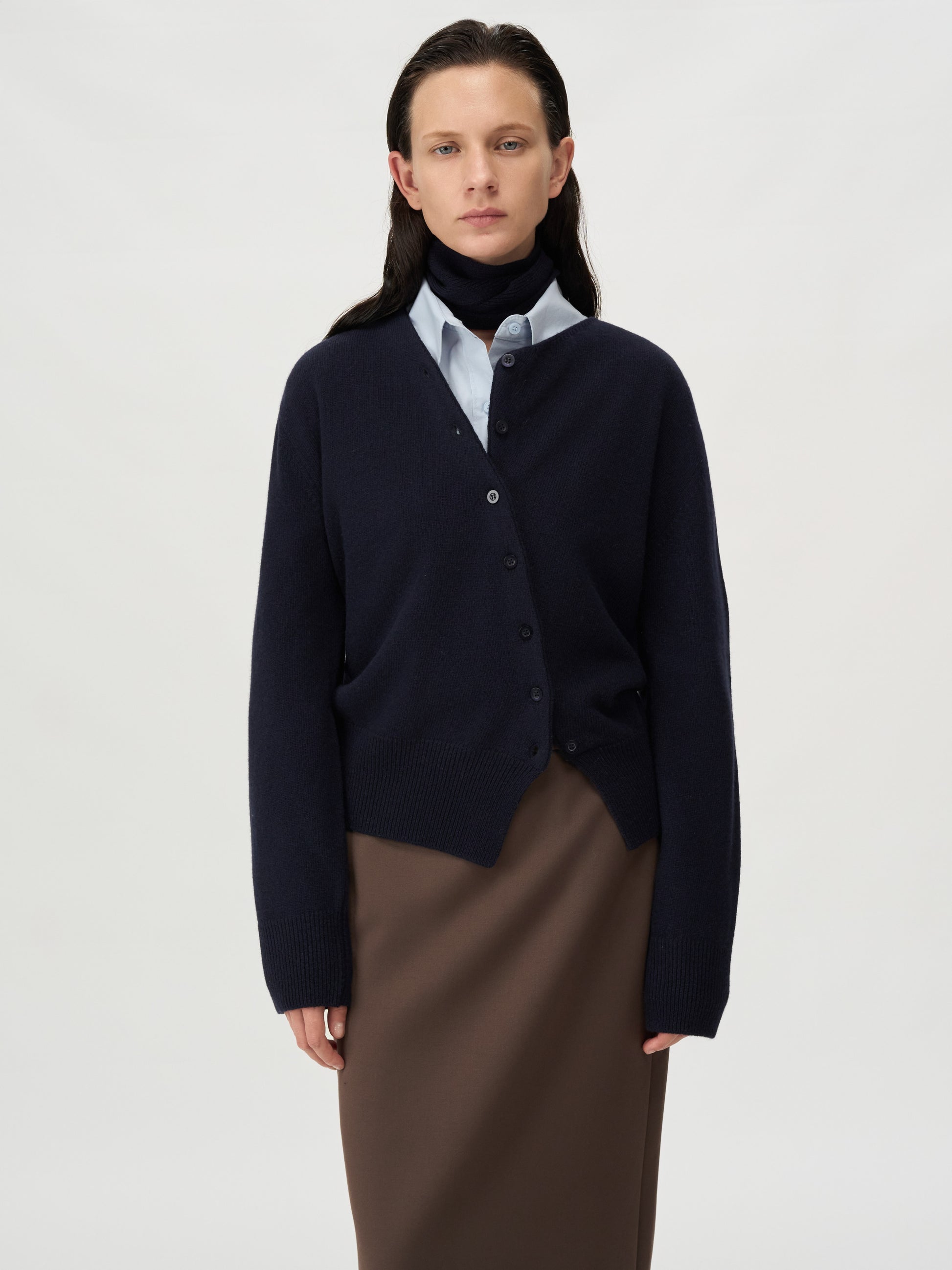 カーディガンはさりげないサイドボタンの斜め留め仕様で、留め方によって印象が変わるユニークなデザイン。