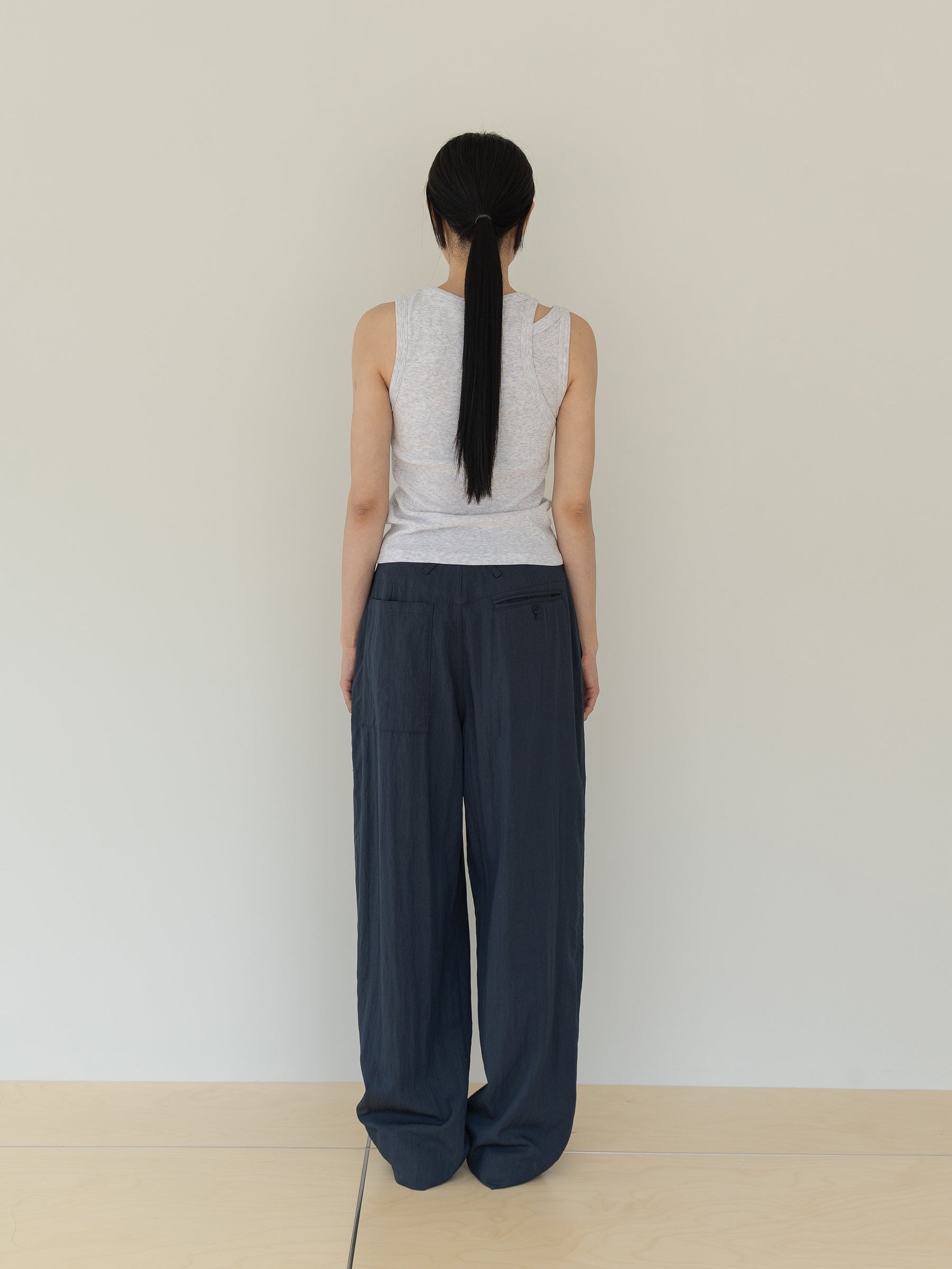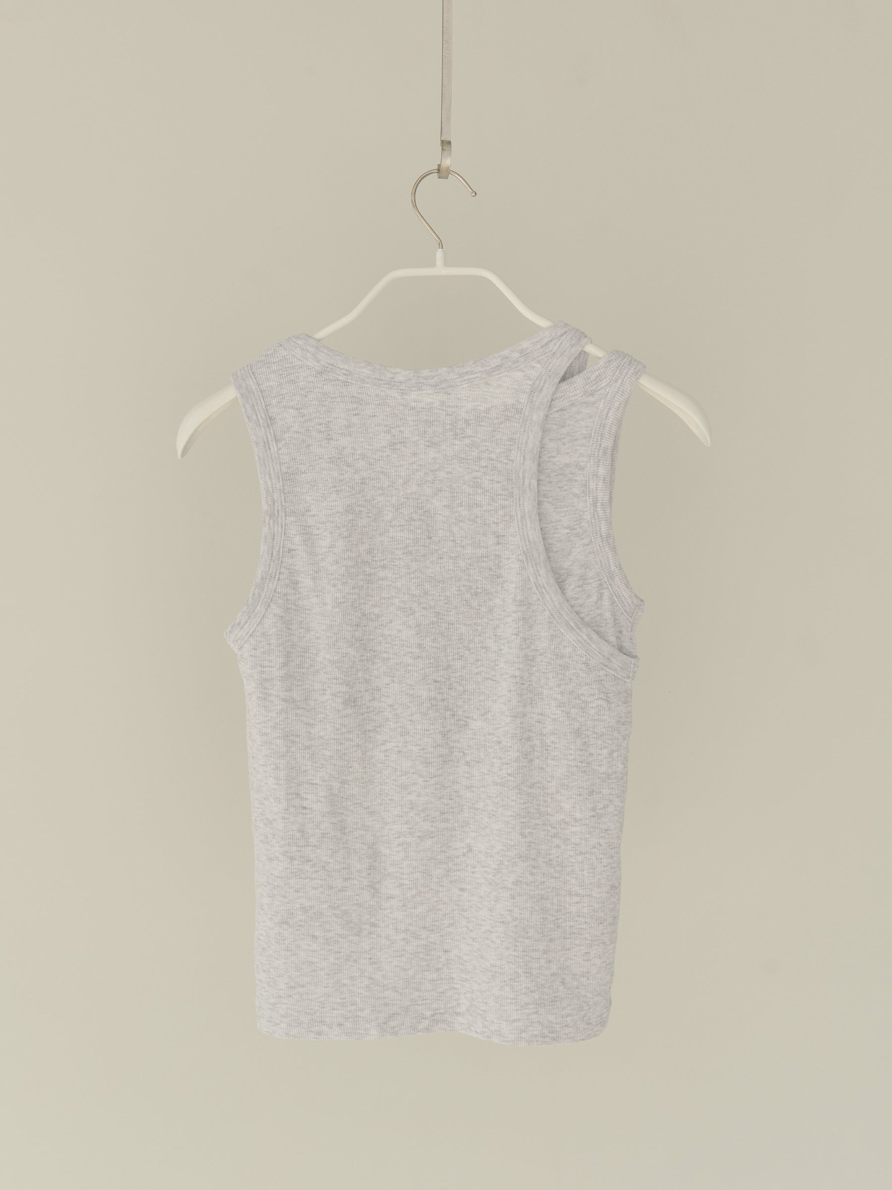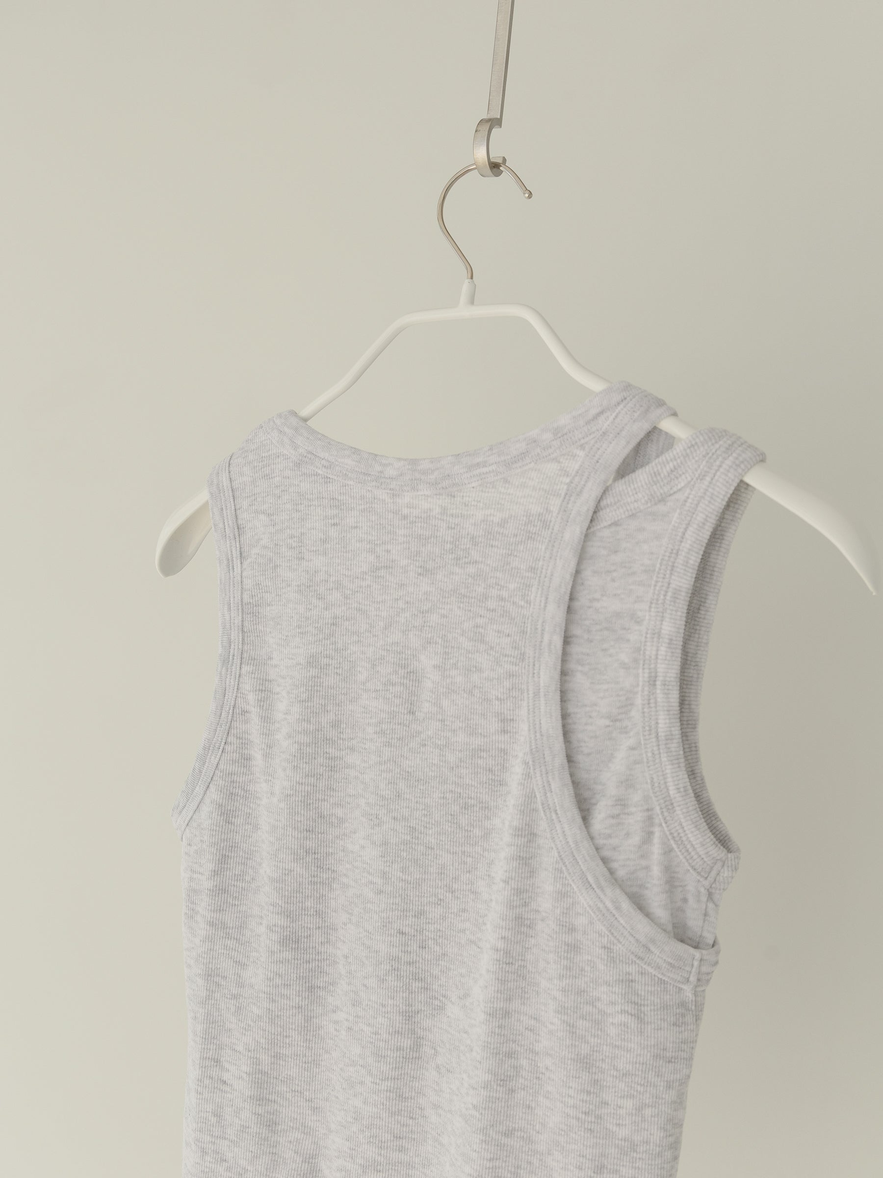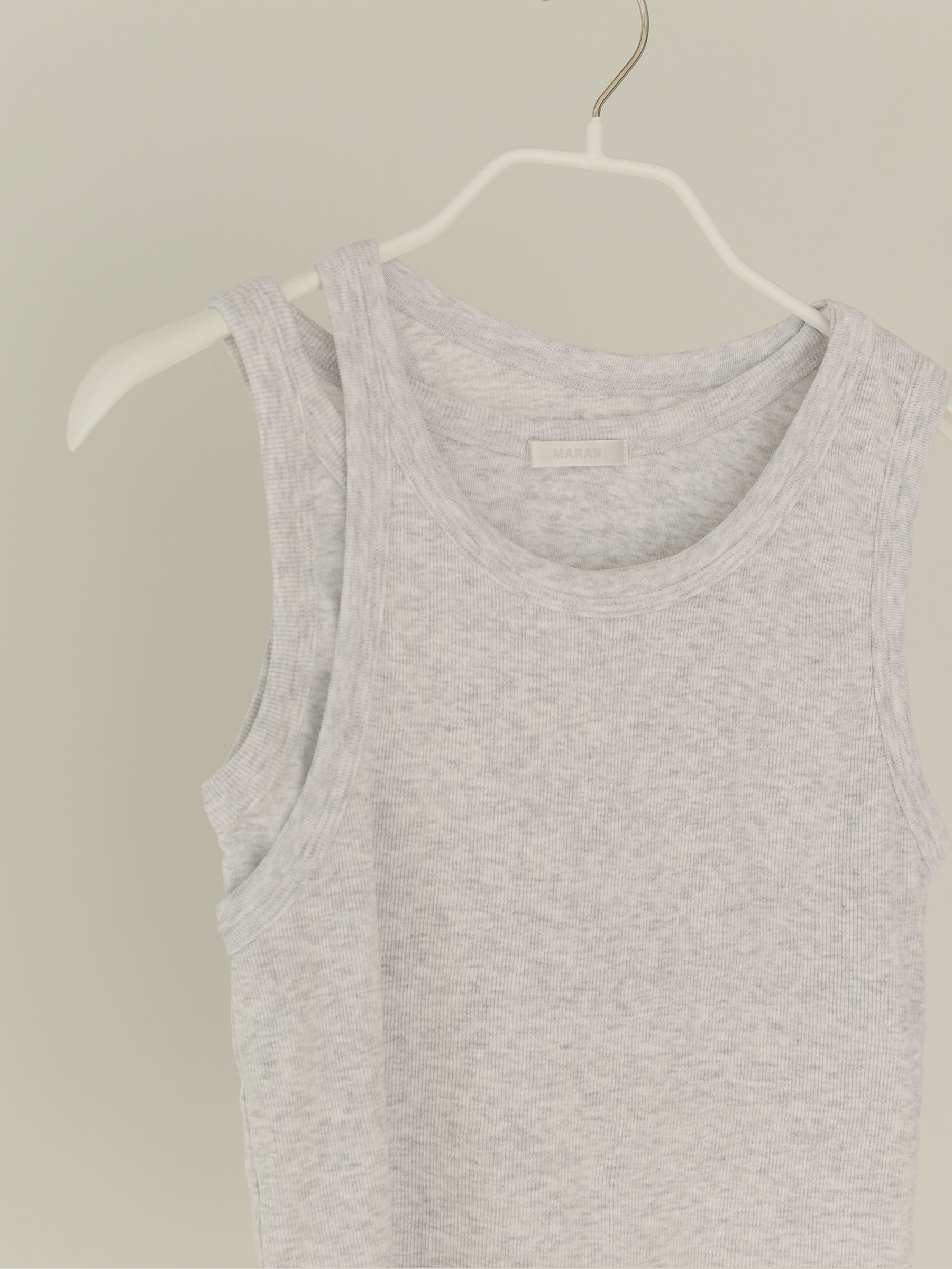 片側にレイヤードデザインを施したリブタンクトップ。デザイン性と機能性を兼ね備え、内側にはズレ防止のバンドを配置。着用時の安定感と、リブ素材による快適なフィット感を実現しています。完成後にウォッシング加工を施すことで、洗濯による縮みや型崩れを軽減。シンプルながらも1枚で存在感のあるアイテムです。