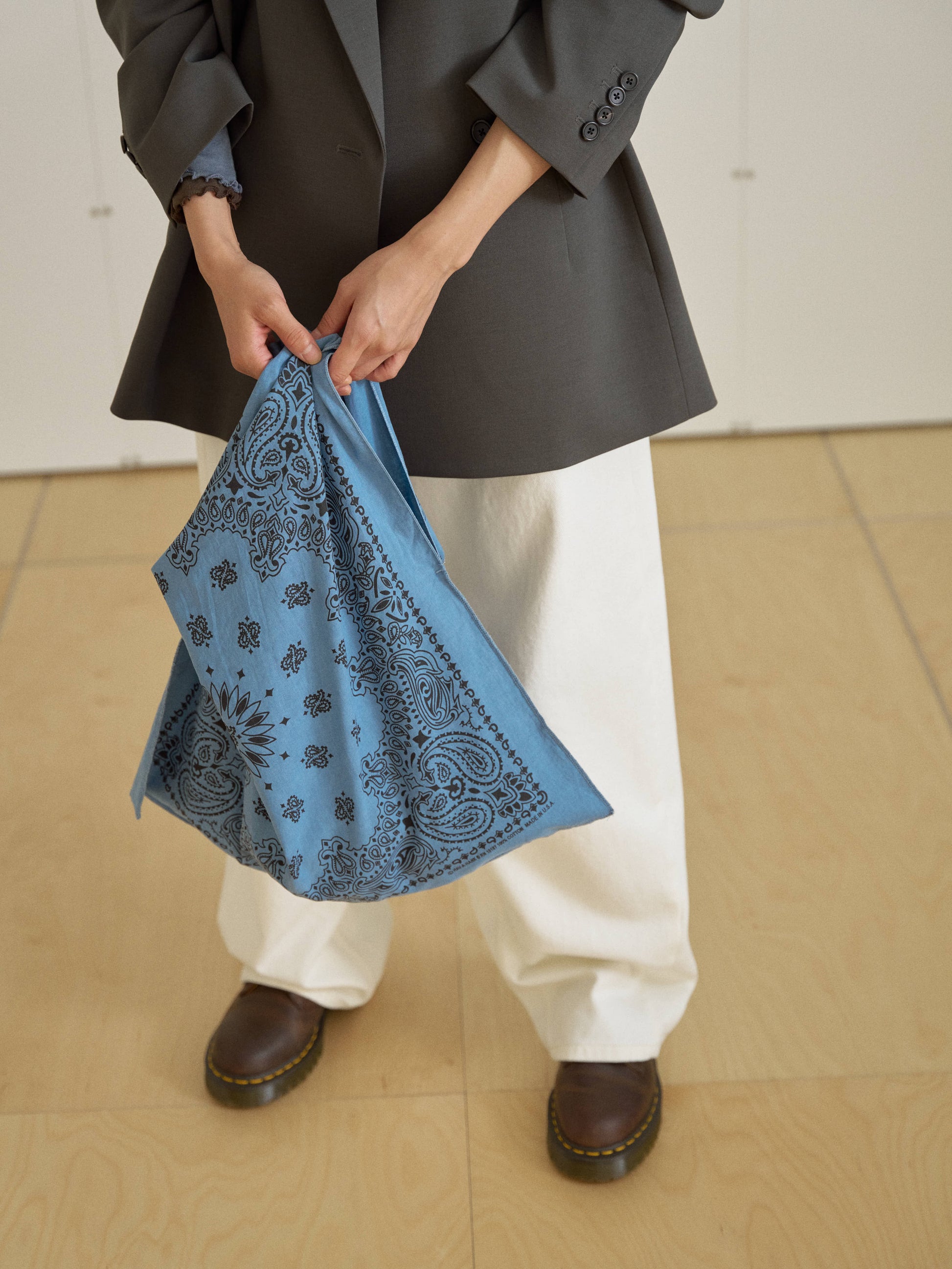 ハバハンクのバンダナ生地で仕立てたスクエア型バッグ。
