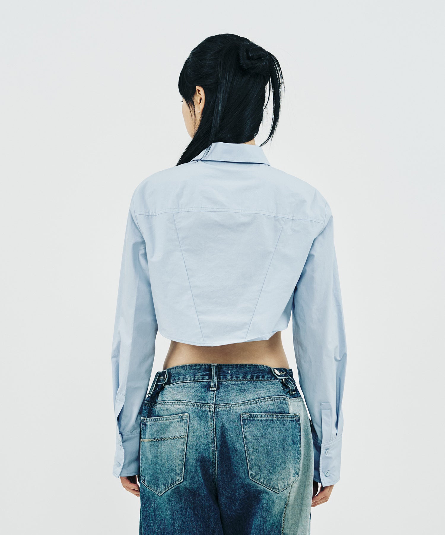 フロントポケットの実用性とデザイン性を兼ね備えた、クロップド丈のロングスリーブシャツ。