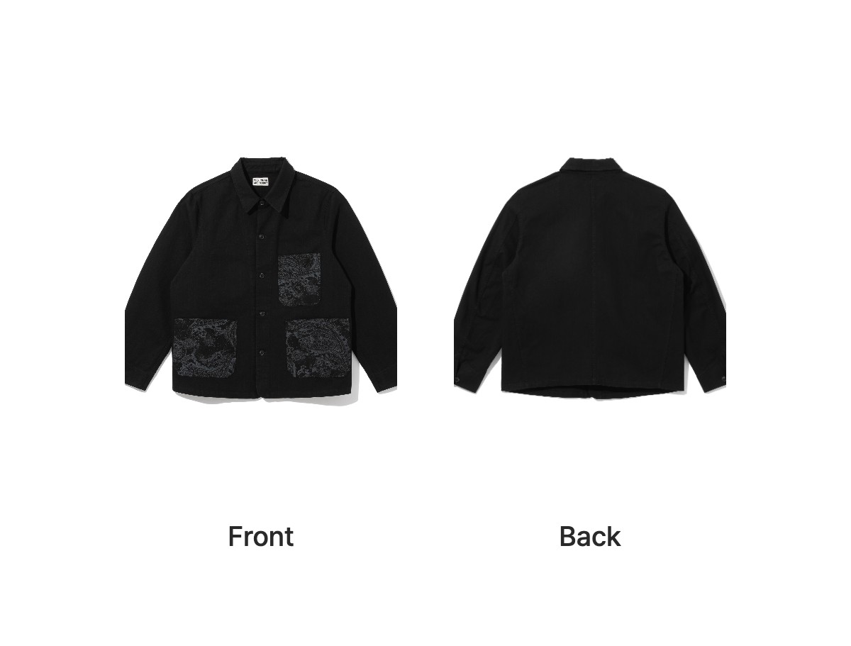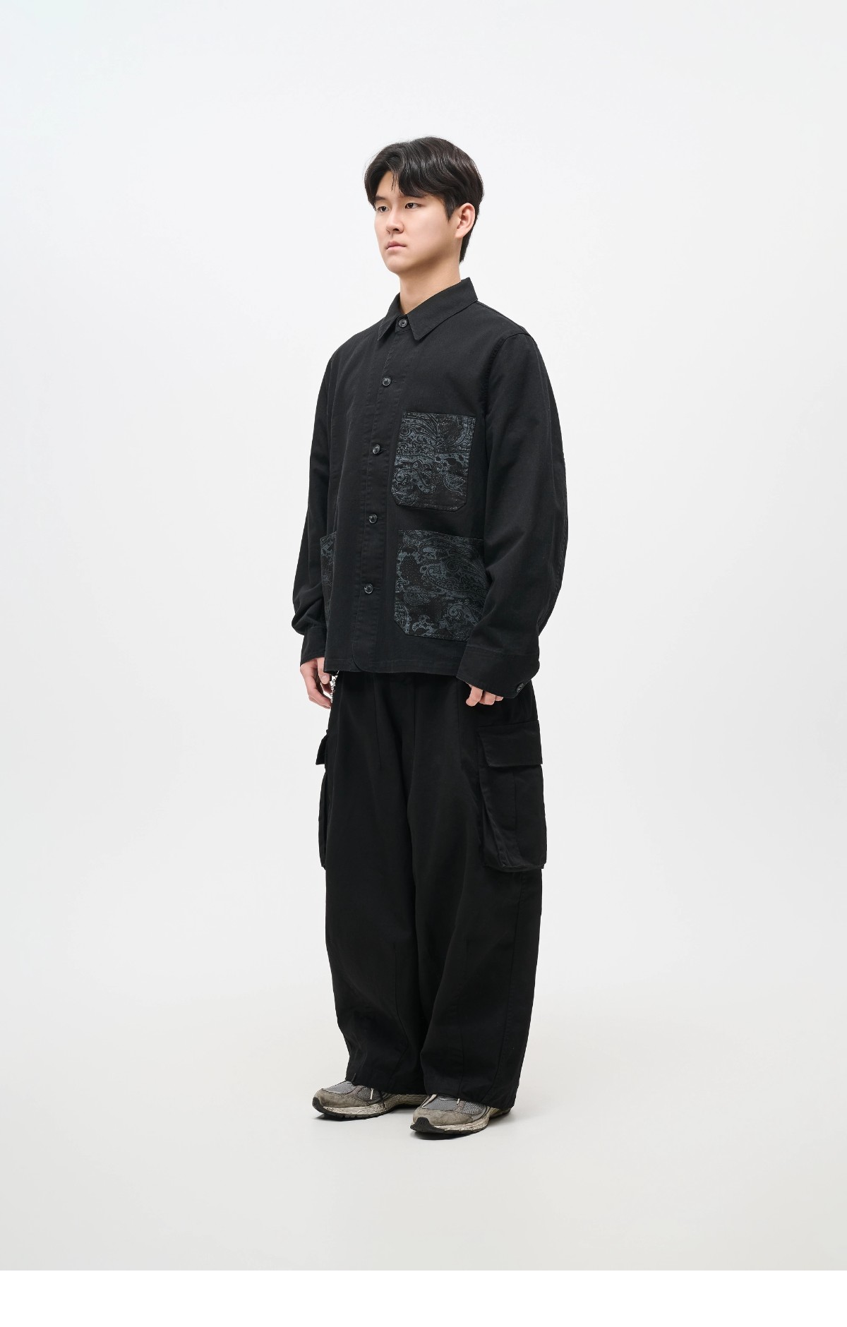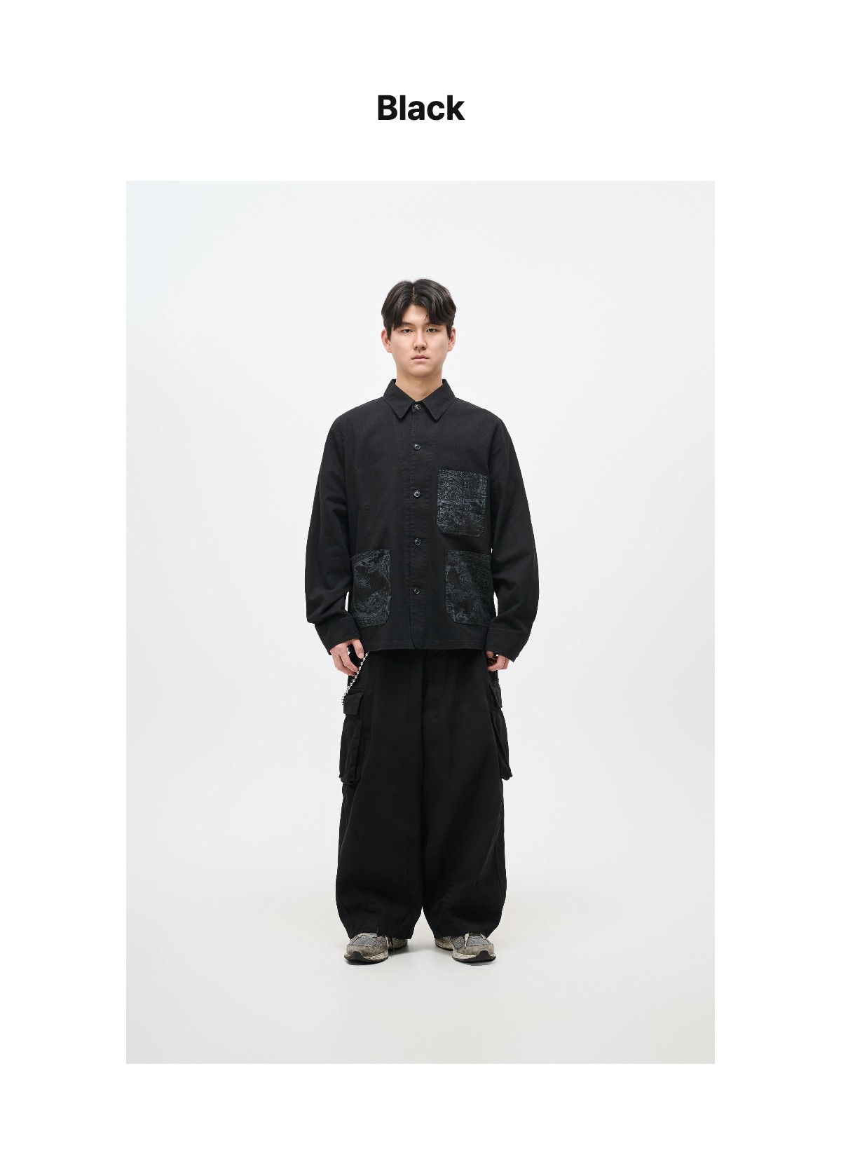 シンプルでありながら、個性を放つ「SHIR JACKET」。オールブラックのボディに、さりげなく存在感を示すペイズリーパターンポケットがアクセント。上質なコットン素材を使用し、程よいハリ感と柔らかさを兼ね備えた一枚です。フロントボタン仕様で着脱がしやすく、羽織りとしてもシャツとしても活躍。ルーズシルエットがリラックス感を演出し、ストリートからカジュアルまで幅広いスタイリングにマッチします。