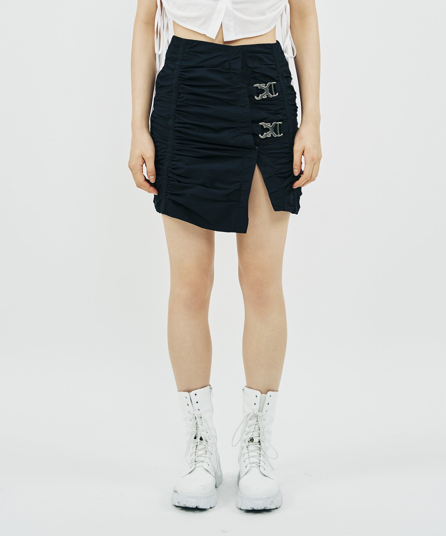 ナイロン特有のハリ感と軽さを活かし、アシンメトリーなシルエットに仕上げたシャーリングスカート。